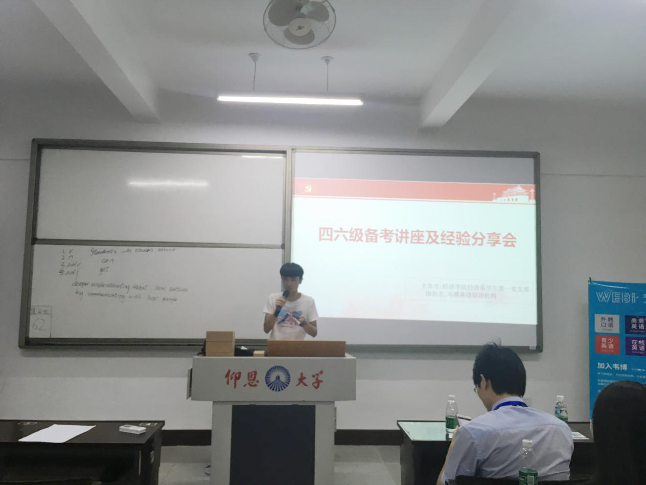 活动首先由韦博英语机构的陈老师讲解备考四六级的一些技巧,依次从四六级考试的考核要点、听力、阅读、翻译和作文等部分进行展开介绍,给予同学们每个模块备考的一些技巧性建议。为了加强同学们的备考积极性,经济系一支邀请了英语四级过500分的17英语专业的曾佳俊、16金融专业的陈秋艳和16国际经济与贸易专业的李诗婷这三位同学来分享他们的备考经验。曾佳俊同学主要分享了他在各个模块的备考经验,并着重分享他的强项听力部分的学习技巧;陈秋艳同学则通过自述自己花了七天的时间用百斩词APP背下四级需要的3500个词汇量,从而顺利通过了四级,她建议同学们要积累自己的词汇量;李诗婷同学则强调通过真题训练也十分有效,同时应将考试的重心放在自己最擅长的部分,用自己的擅长的部分来弥补不足的部分。