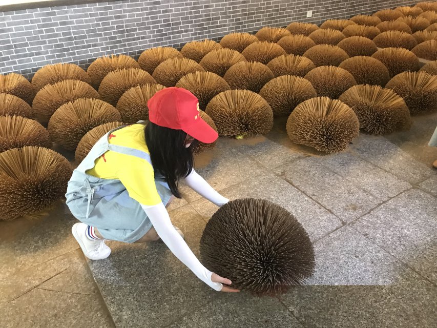 做好的香第一时间放在太阳底下晾晒,香气随着水分的蒸发愈发浓郁。说到晒香不得不提到永春制香的一道独特的风景线----跺香花。先将篾香扎成一捆,立在地上,用双手轻扶着然后很快地朝一侧转开,稍一调整,香便呈一朵绽放的花状。为了让实践队员们更近距离的了解制香过程,公司人员带领队员们体验了一把跺香花的乐趣。