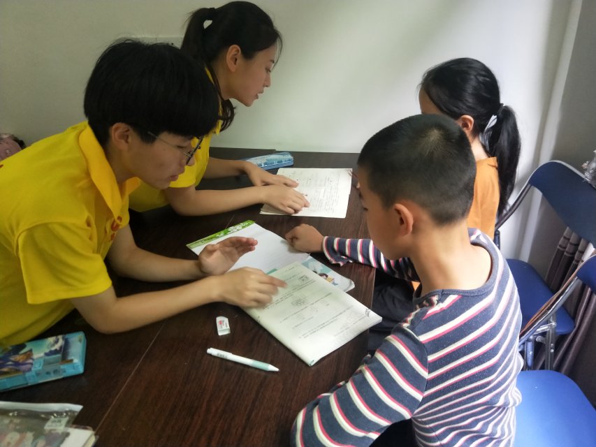 图为实践队队员为孩子们辅导作业