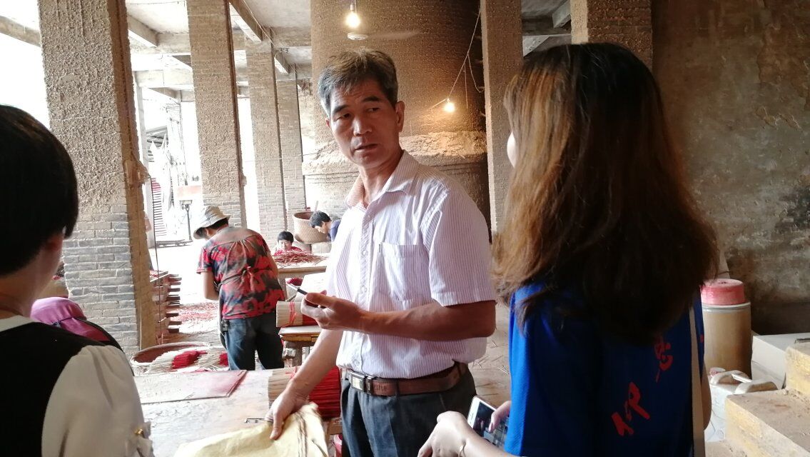 通过村委会负责人详细的介绍,实践队员们对汉口村香产业的产品销售情况有了较为全面的了解。目前,汉口村每年生产的香产品除了销往国内各大城市,还远销泰国、印度尼西亚等东南亚国家。此外,实践队员们参观了汉口香厂——一家具有三十多年历史的老制香厂。在香厂负责人的介绍下,实践队员们了解制作永春篾香的工艺和具体步骤。制作永春篾香分为制签、裹粉、晒香、染色、包装五个环节。实践队员们走上街头,采访香产品个体销售户,了解近几年汉口村香产品的销售状况,并详细记录。实践队员们还与福州大学生物工程学院科普服务实践队因香结缘,共同探索汉口村发展的历程,讨论乡村振兴与发展的实践经验。