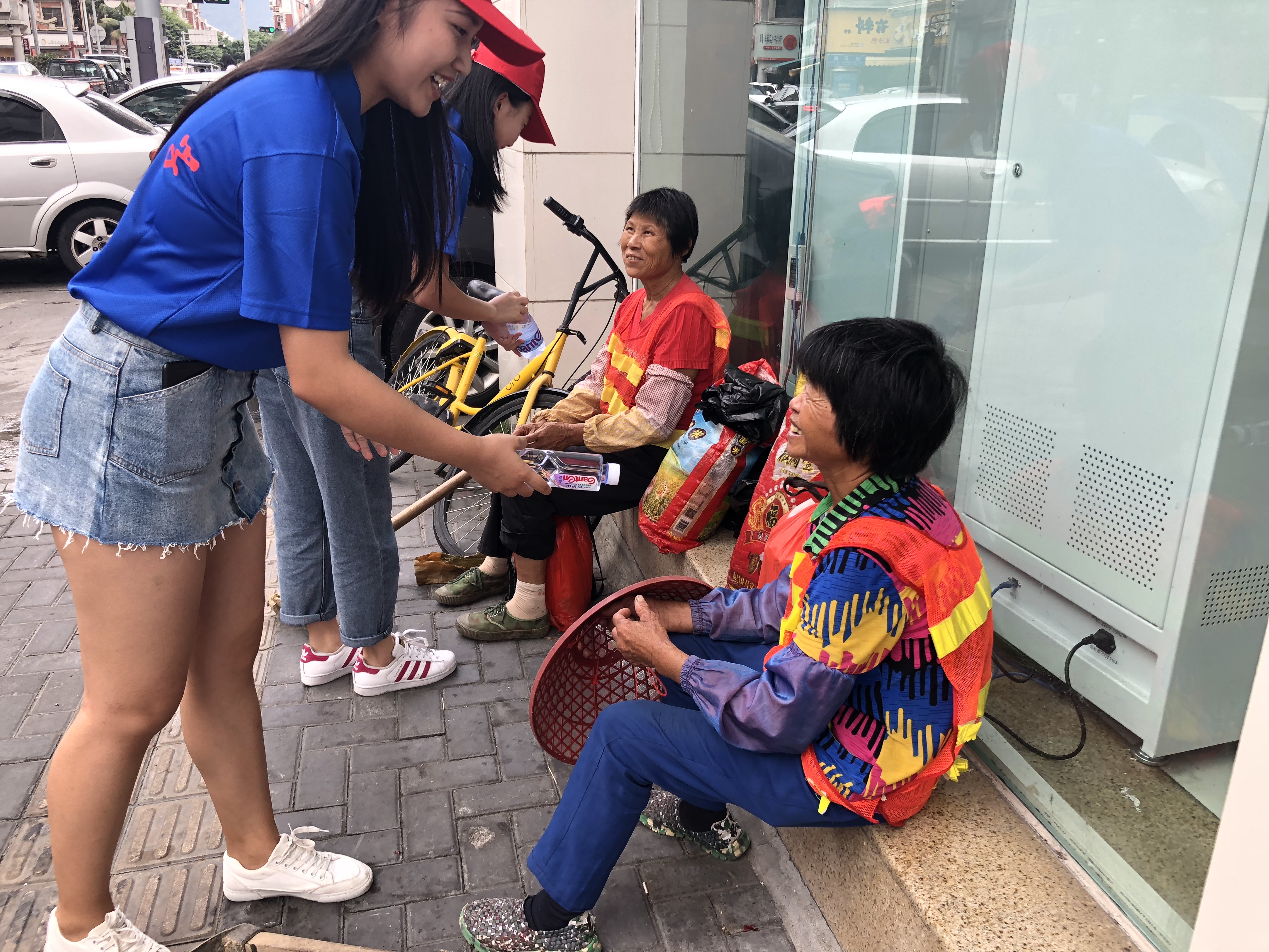 (图为队员们为马路环卫工人送上爱心之水)