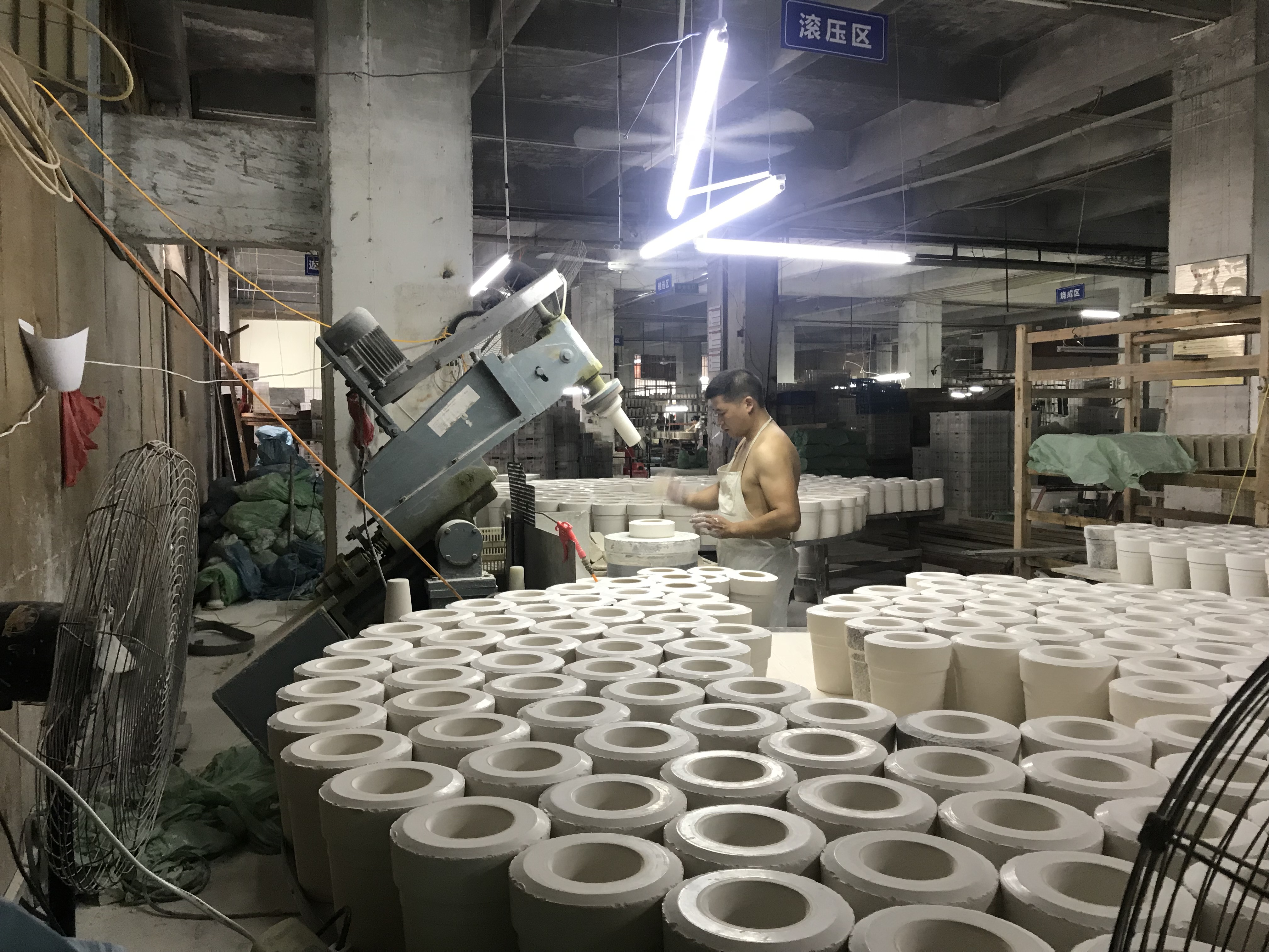 (图为工厂采用机械化方式注浆、机压使模具成型)