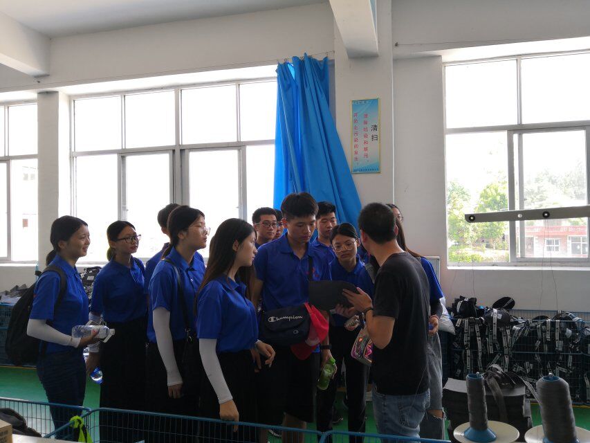 此次调研活动旨在调研河泰兴箱包有限公司在乡镇经济转型升级下的发展现状,实践队一行在生产车间林主任的带领下开展了此次调研活动。林主任首先为实践队员介绍了公司的主营方向、发展状况以及生产方式。从林主任口中实践队员了解到,该公司以生产、销售箱包和手袋轻工业为主。销售方向主要是内销和出口。随后,林主任带领实践队员们参观河泰兴箱包有限公司的四大车间 ——“缝制车间”、“包装车间”、“辅助车间”、“仓储车间”,让实践队员进一步了解河泰兴箱包生产、拼装、质检、打包的具体流程。