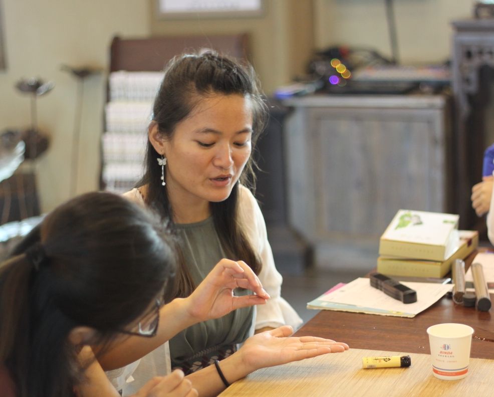(图为彬达公司文化创意园总监曾少芳小姐分享鉴别香的优劣的方法)