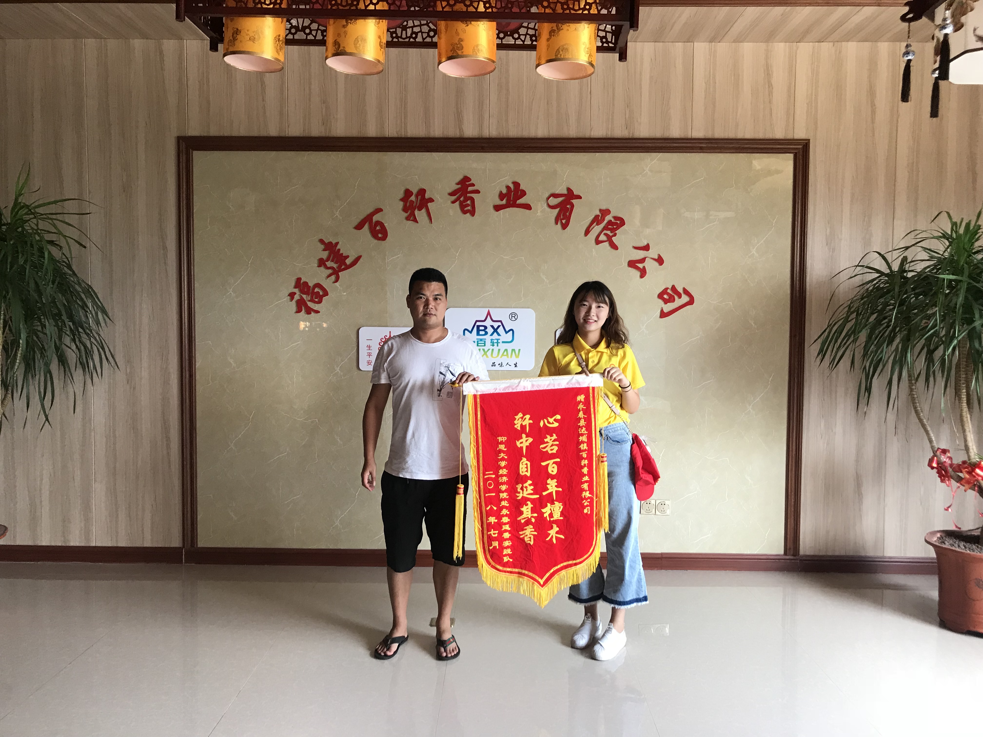 经过20天的专业实践,在各家制香企业的大力支持下,yl23411集团赴永春延香实践队大有收获。为表示感谢,实践队员们制作了锦旗,分为四组,前往百轩香业、兴全香业、达盛香业、永发合作社赠旗。实践队员们受到了单位负责人的亲切接待,其中白轩单位负责人鼓励实践队,要继续发扬探索精神,在调研制香的道路上继续前行。最后,实践队员们与各单位负责人进行合影留念。