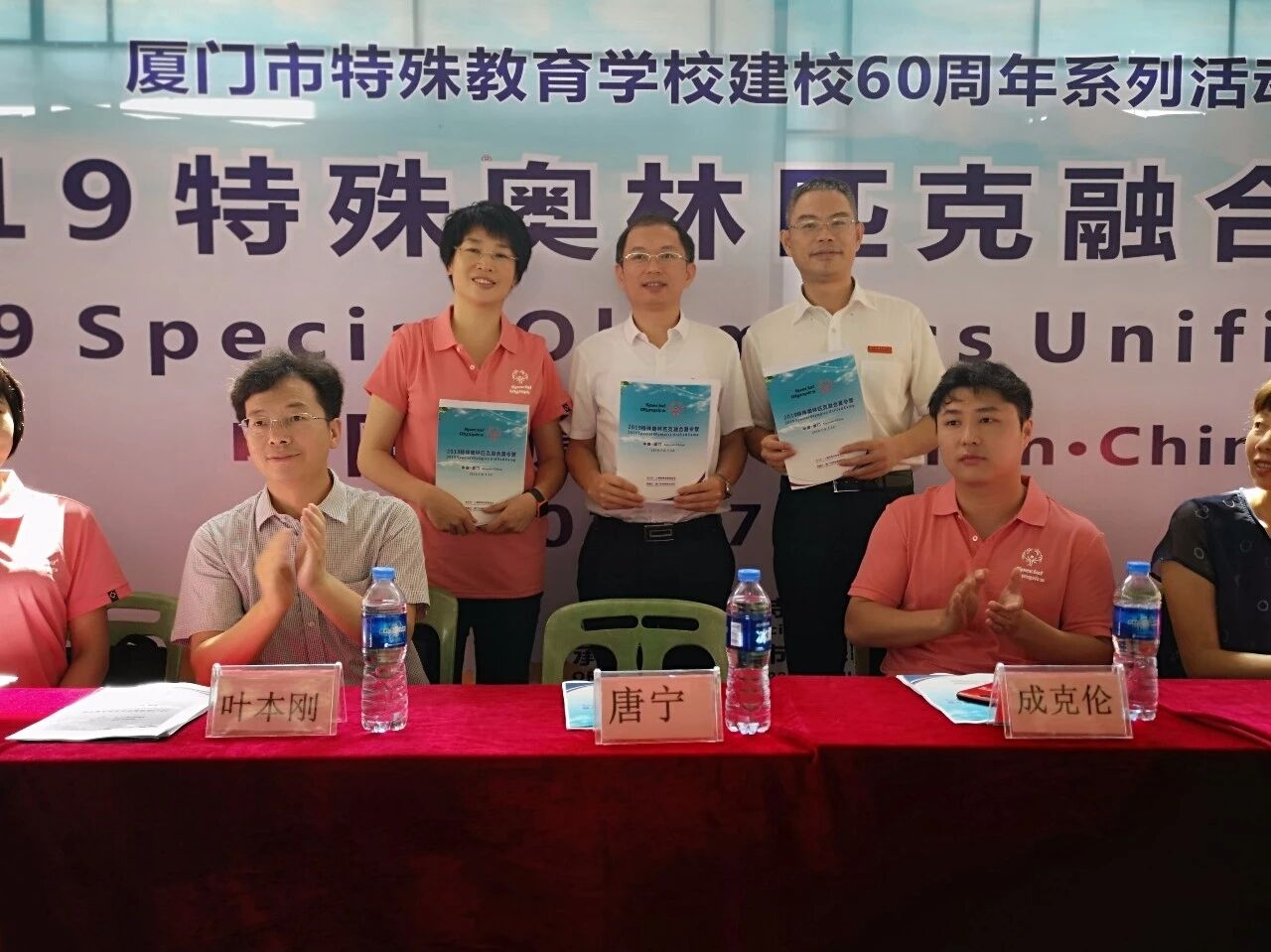 7月8日星期一,yl23411集团papazao实践队前往厦门城市职业学校参加了由上海特殊关爱基金会主办、厦门市特殊教育学校承办的“特殊奥林匹克融合夏令营”的开营仪式与初次训练。