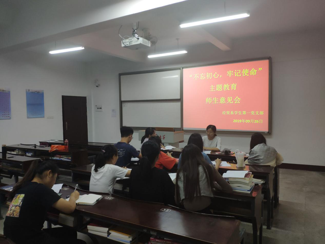 2019年9月26日,经贸系学生第一党支部于仰恩楼A1-109召开“不忘初心牢记使命”教师党员意见会,支部书记林丽华主持召开会议,经贸系学生第一党支部全体党员出席会议。