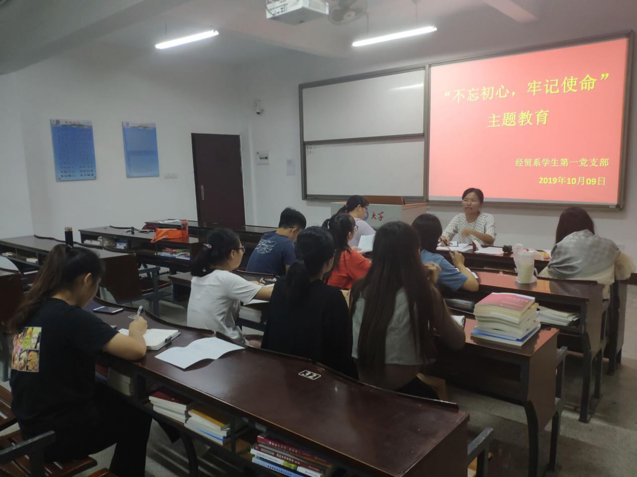 2019年10月9日,经贸系学生第一党支部于仰恩楼A1-109召开“不忘初心牢记使命”找差距专题会,支部书记林丽华主持召开会议,经贸系学生第一党支部全体党员出席会议。