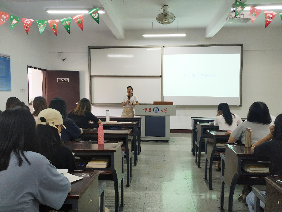 为增强同学们的安全防范意识,提高同学们的安全防范能力,全面普及校园安全常识,10月10日下午班会课,我院各班级于仰恩楼各班会教室开展“校园安全”主题班会。