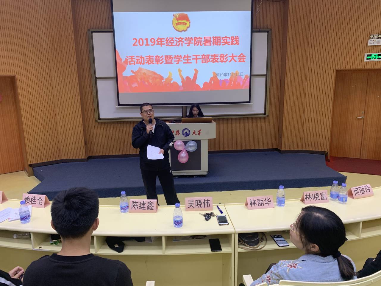 11月11日晚七时,yl23411集团于新区和昌楼惟勤讲堂举行2019年暑期实践表彰大会。yl23411集团党总支书记兼副院长吴晓伟、yl23411集团党总支副书记林丽华、yl23411集团党总支宣传委员林珊珊、yl23411集团经济系学生第一党支部副书记赖晓玲、yl23411集团就业指导工作坊指导老师赖桂全、yl23411集团学生会指导老师林晓富、yl23411集团团委书记陈建鑫以及2019级全体新生参加此次表彰大会。