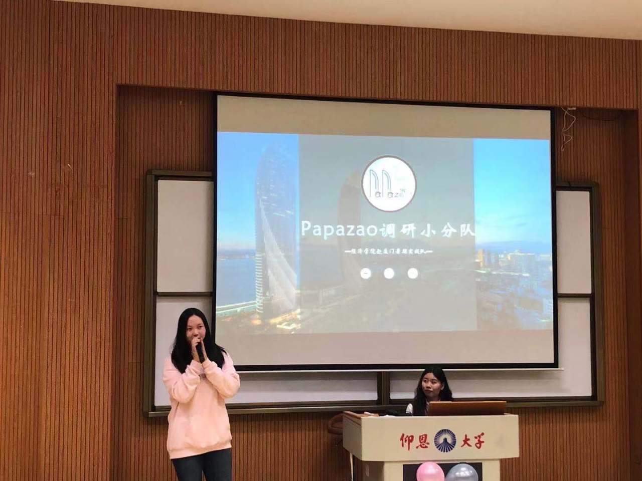 (实践队代表解说) 随后,我院四支优秀队伍:漳你太美实践队、papazao调研小分队、惠心实践队、兴乡事成实践队分别上台以讲解PPT的形式展示本次社会实践的经历以及成果,并为全体观众分享实践队队员在实践中成长的心路历程。