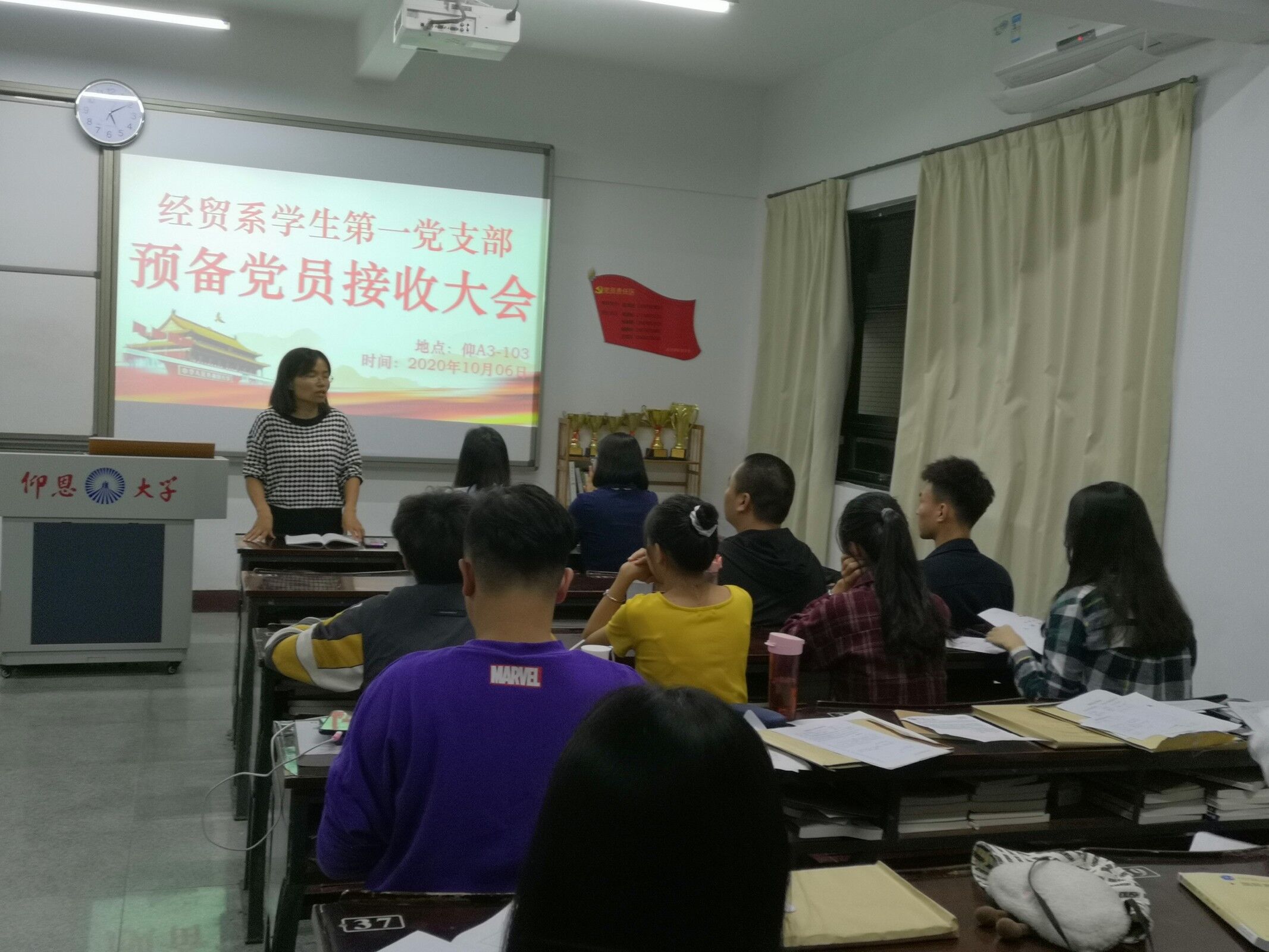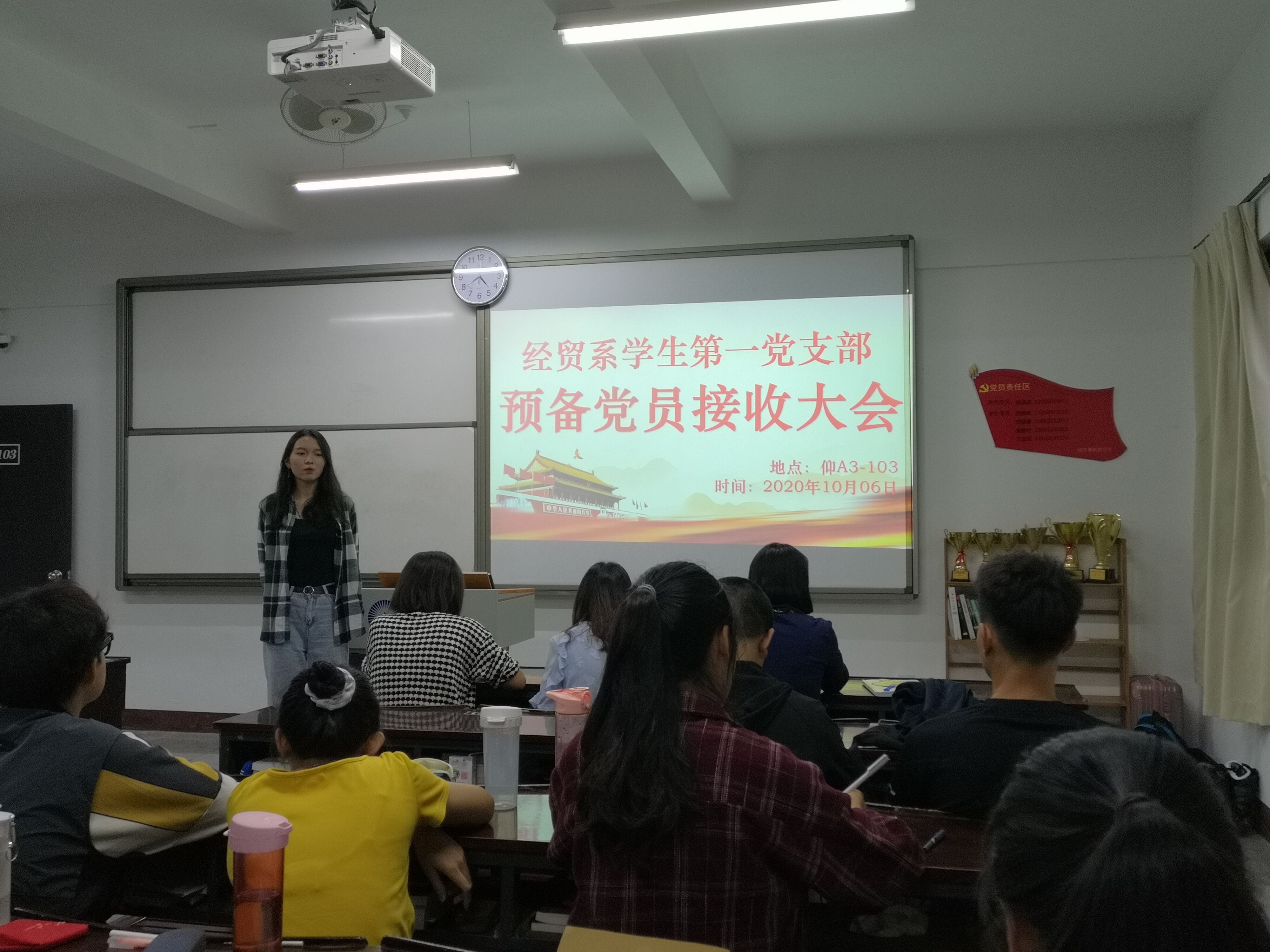 为响应党的号召,吸收优秀同学,yl23411集团经贸系学生第一党支部于2020年10月6日在仰恩楼A3-103召开中共预备党员接收大会,本次会议共有10名党员出席,由支部书记林丽华主持。