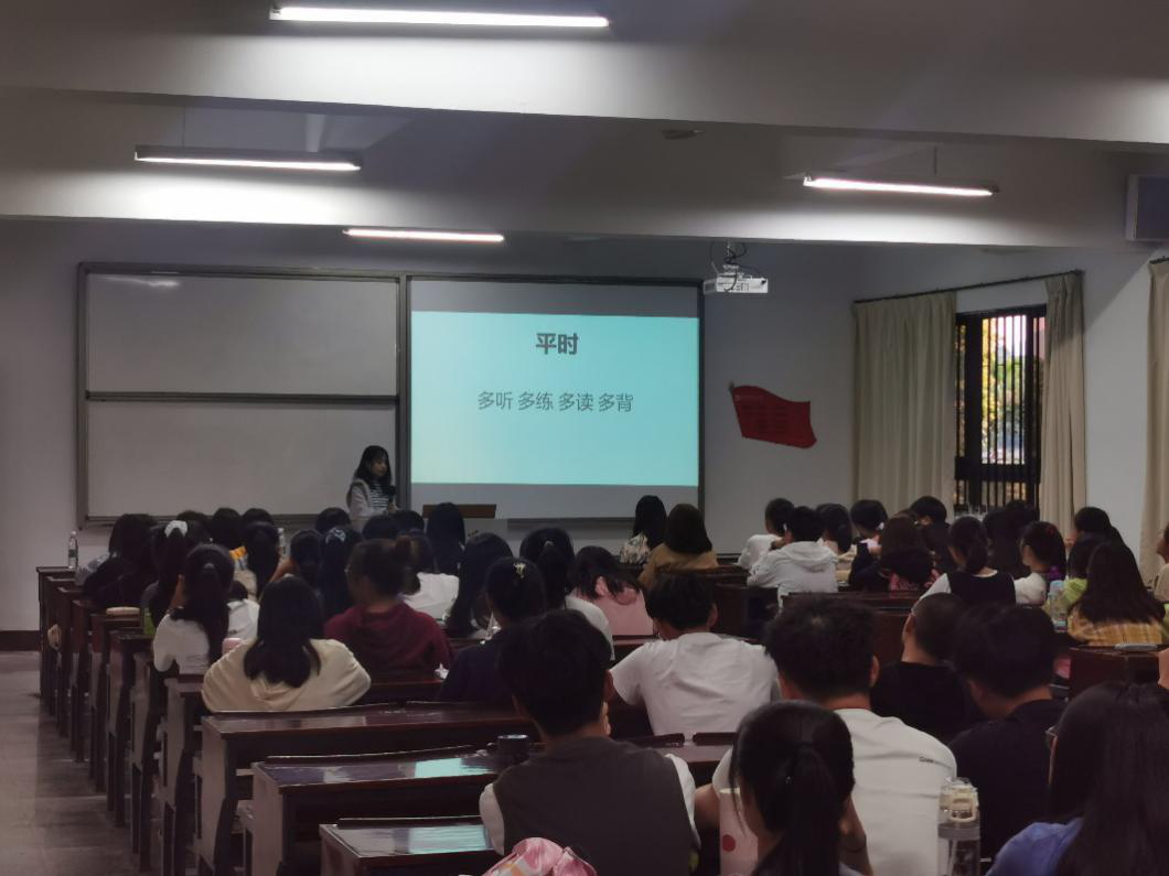 会议开始,首先由外国语学院英语专业的庄晟强同学向新生们整体梳理了英语四级考试的有关题型,提出“努力提高英语听力水平以及加强阅读理解精度技巧”是通过考试的关键。随后,英语学习社社长罗思雅向到场新生分享了自己两次四级考试的经验教训,并针对听力考试时的易错易混点作了简单的讲解。别类分门、因材施教,特邀优秀学生林婷婷和陈清清针对不同英语水平的新生,提出“找优势、补短板、勤学习”的建议,鼓励水平较低的同学“多学、多读、多问”,争取在有限的时间内获得能力之内的最高分数。最后,国贸新生班导王梓谦以四级真题为例,从六个方面对四级英语题目做了深度剖析,使新生能够从几位优秀前辈的经验中总结出最适合自己的方法,早日通过四级。