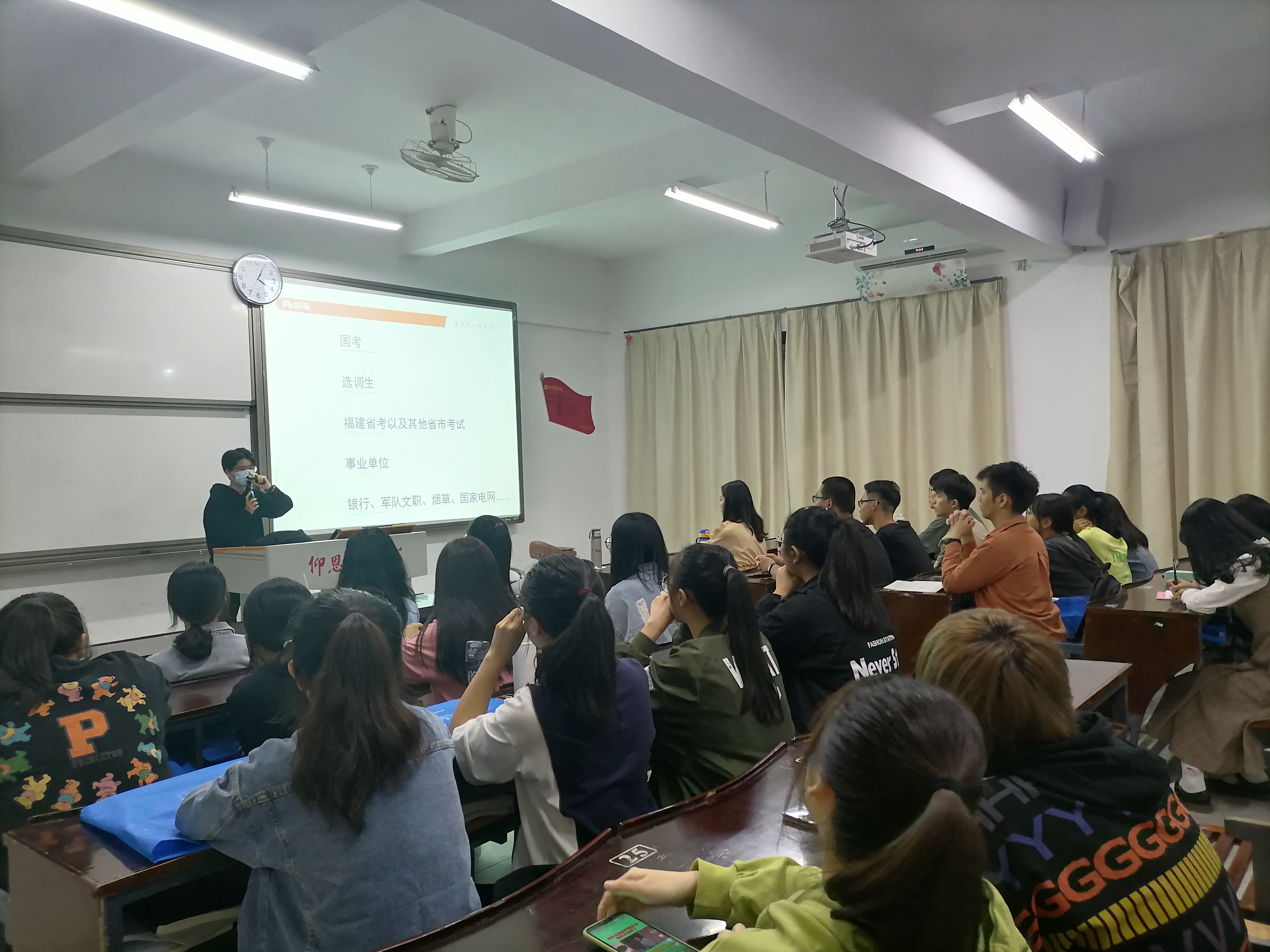 为增加大学生对国家公务员考试的了解,提高同学的备考水平,10月15日晚七点,yl23411集团就业指导工作坊于仰恩楼A4-103举行了国考备考指导讲座。主讲人是粉笔教育高级教师陈悦莉。