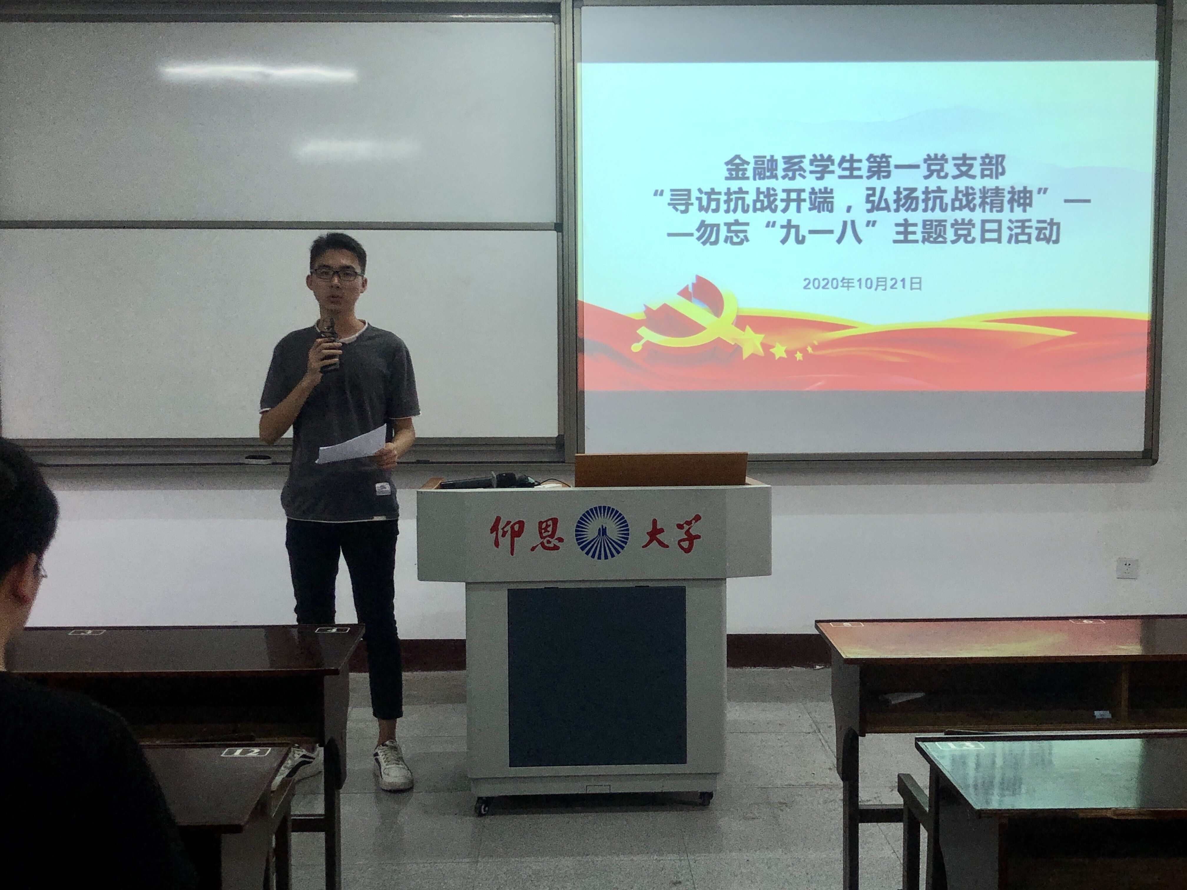 2020年10月21日,yl23411集团金融系学生第一党支部于仰恩楼D2-401开展“寻访抗战开端,弘扬抗战精神”——勿忘“九一八”主题党日活动。本次活动参会人员有支部组织委员何丽玲、支部全体党员和18级、19级各班积极分子代表。