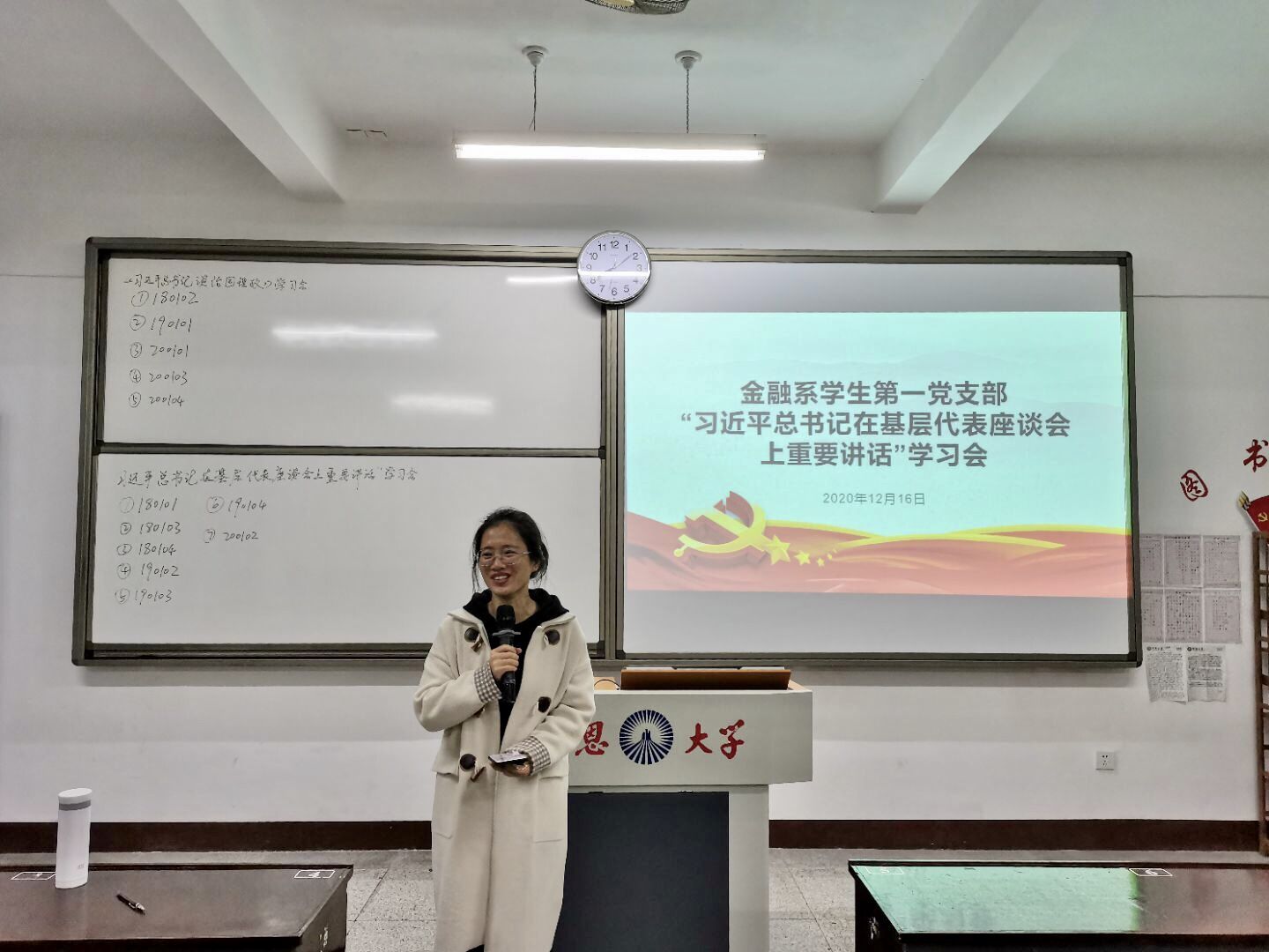 为了深入贯彻学习习近平总书记重要讲话精神,2020年12月16日晚,yl23411集团金融系学生第一党支部于仰恩楼A5-103开展了“习近平总书记在基层代表座谈会上重要讲话”学习会。本次参会人员有金融系第一党支部组织委员何丽玲、支部全体党员以及18级-20级的积极分子。