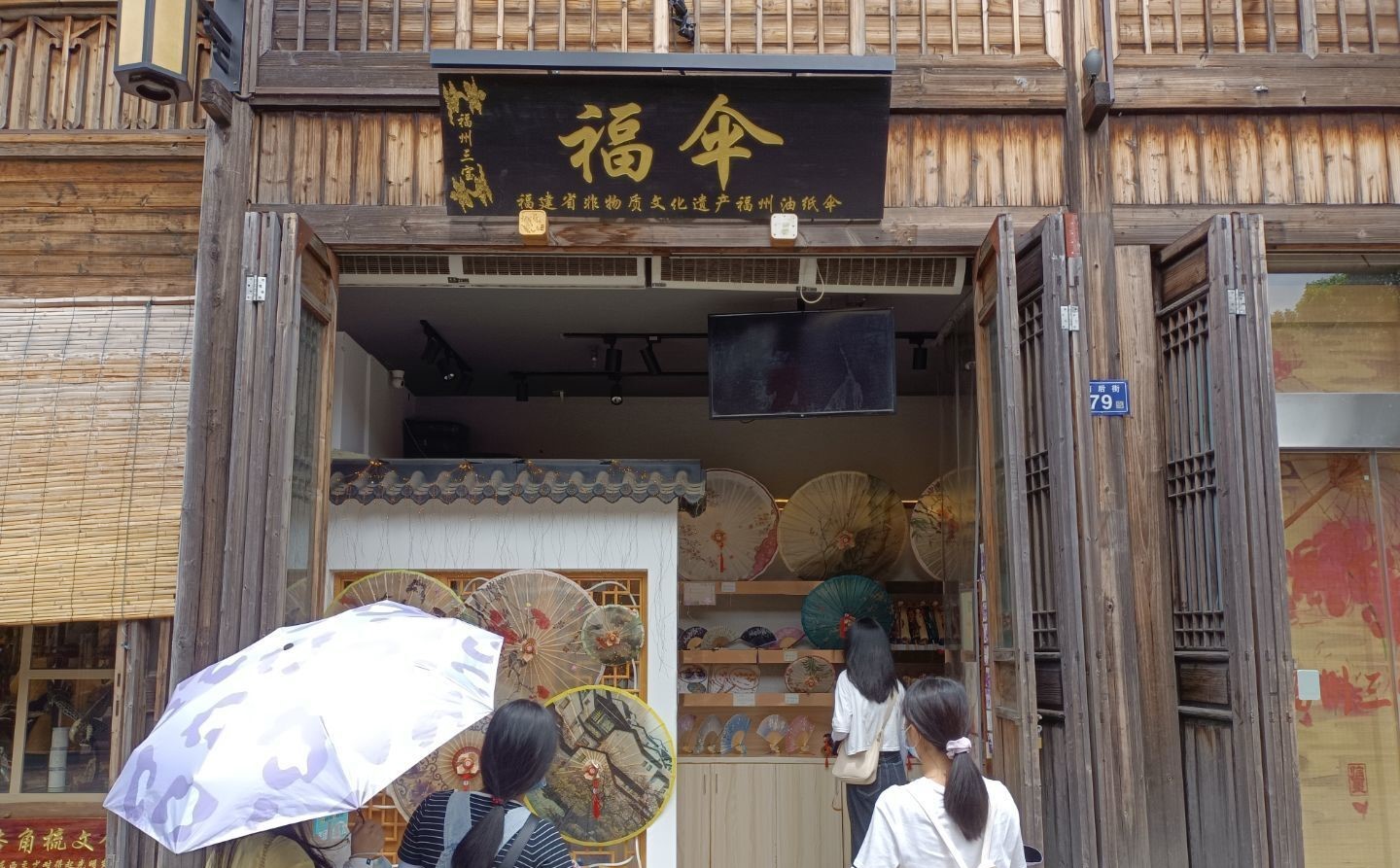 在三坊七巷油伞展示店内,在实践队队员纷纷为制作精细的油伞所惊叹,在店主的讲解介绍下,队员们了解到每一把油伞都需要经过83道制作工序方可完成,每一道工序都凝聚着手艺人的心血。现今,油伞虽以其独特的工艺赢得了世界的赞誉,却因老旧的式样濒临被社会淘汰,油伞业受到巨大的冲击。近年来,随着国家对非物质文化遗产的重视,油伞才得以重新回到人们的视线中来。