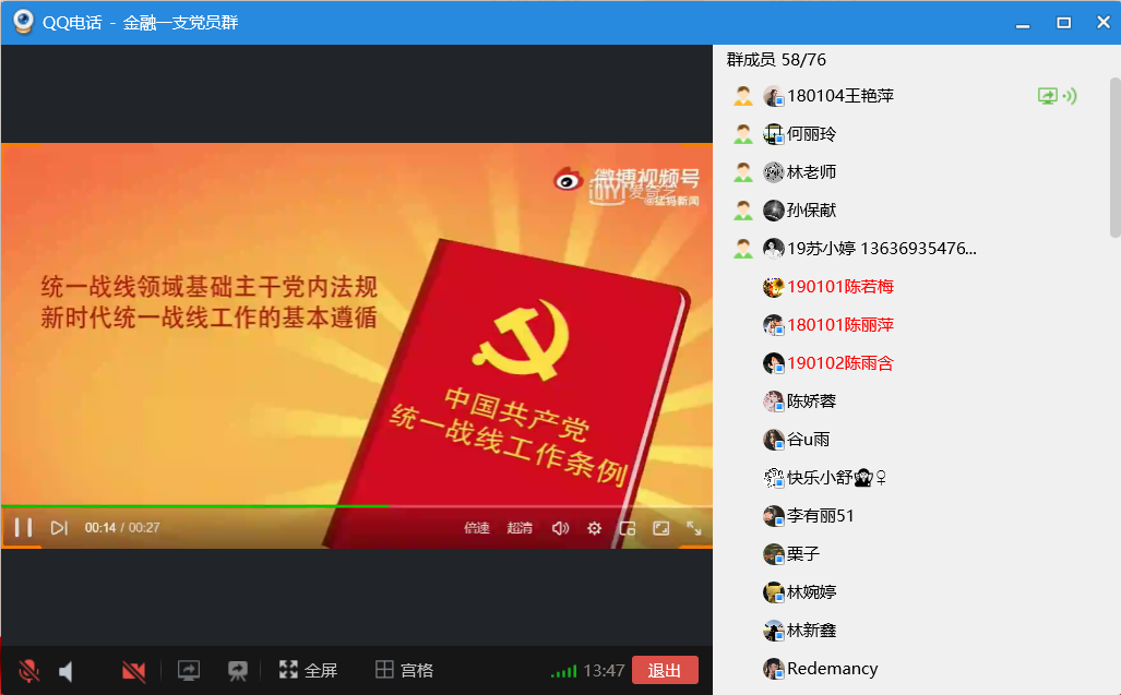 根据中共福建省委统战工作通知要求,2021年9月28日晚7:30,yl23411集团金融系学生第一党支部通过线上会议的方式开展党员学习会,学习新修订的《中共共产党统一战线工作条例》,支部书记孙保献老师、组织委员何丽玲老师与宣传委员林双妹老师出席本次线上学习会。