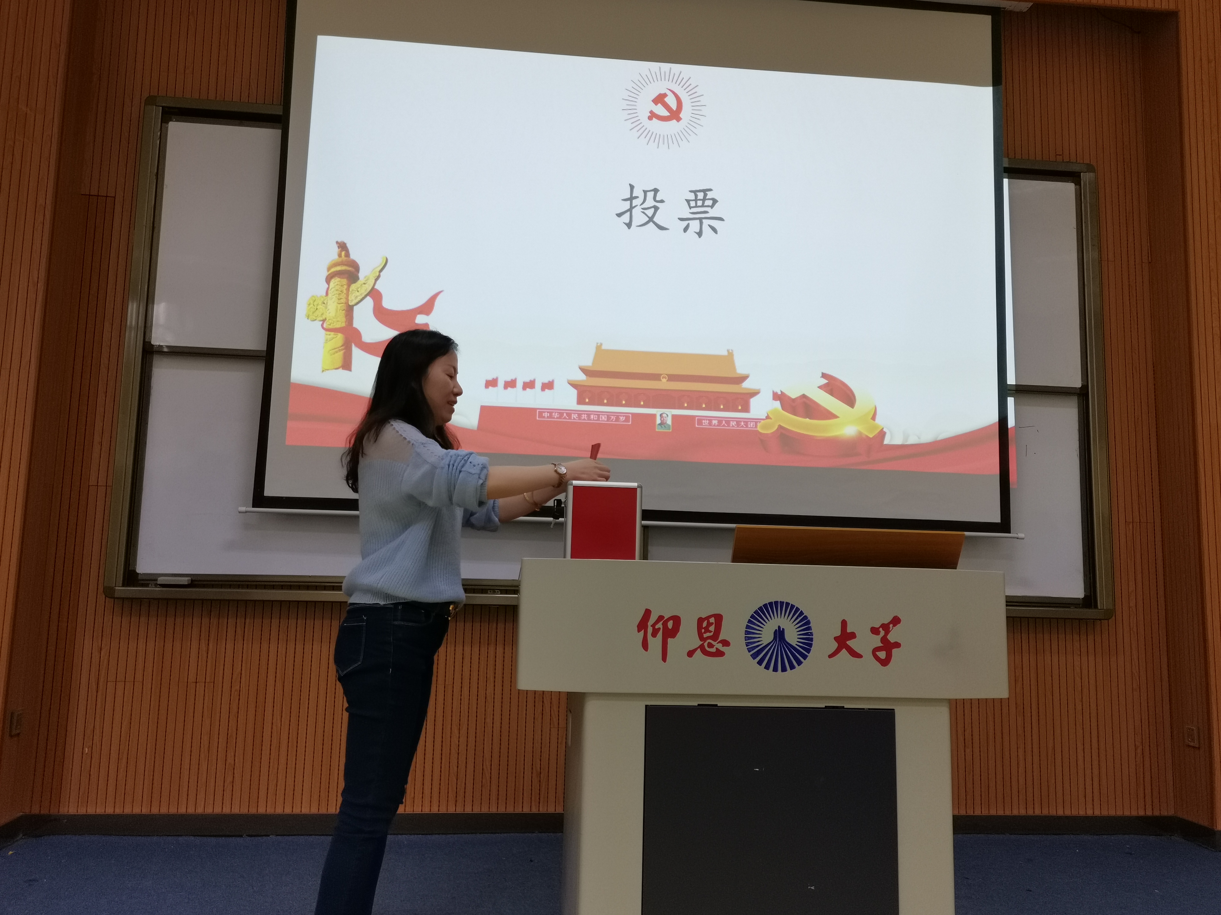 图1 教工支部杨娣同志做工作报告 金融系学生第一党支部支委换届工作会议在博雅讲堂举行,支部应到会有选举权的正式党员共17人,实到会正式党员共17人,超过应到会人数的五分之四,符合法定人数。此次会议由何丽玲同志主持开展,孙保献同志代表上届支部委员会做工作报告,支部全体成员听取并审议工作报告,随后公布支部换届流程,确定候选人名单,发放给党员同志选票,收回有效选票,由党员同志进行现场唱票,最后确定支部此次换届的最终名单并给予公示。