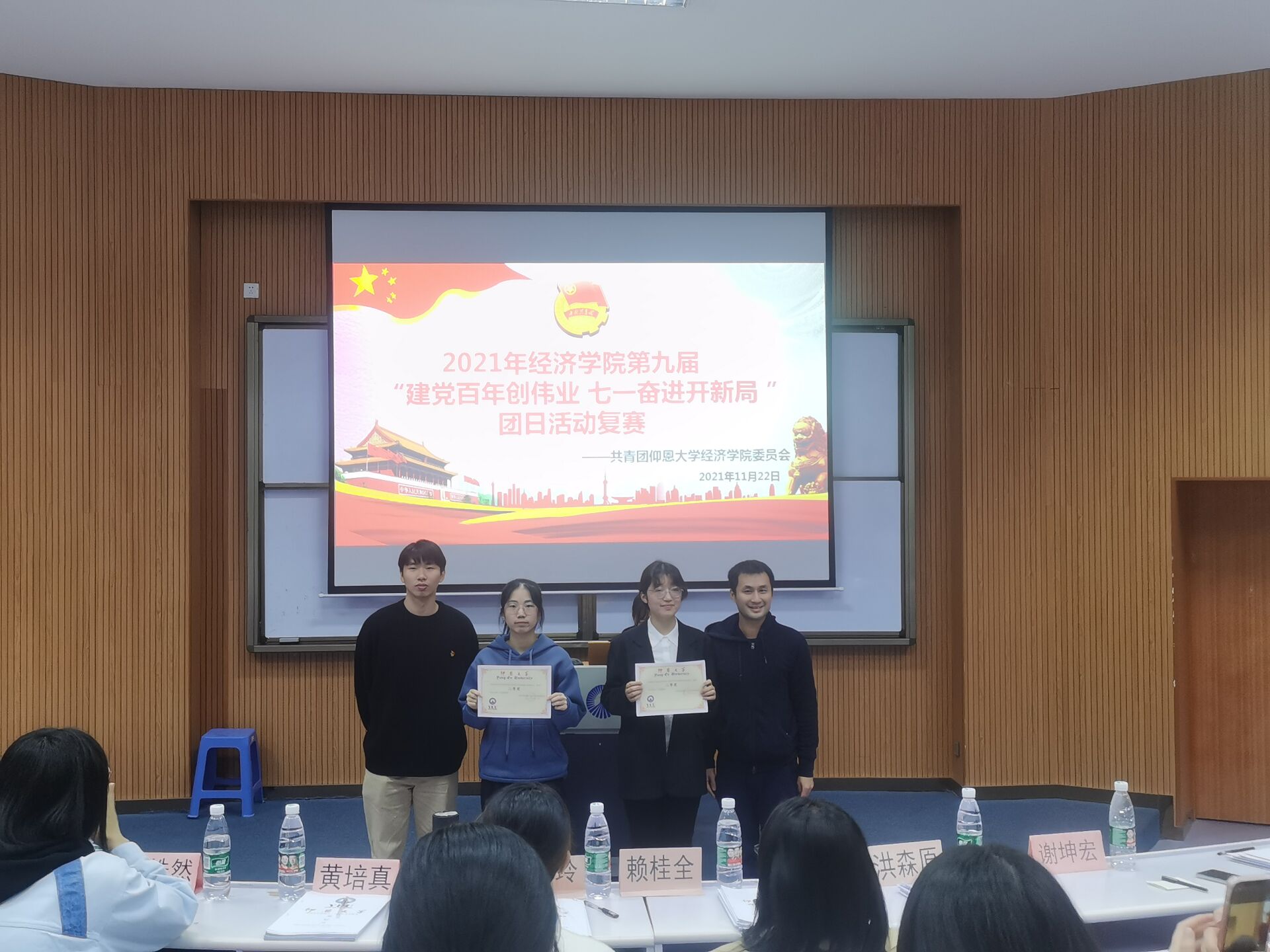 图2 颁奖现场 本次团日活动旨在丰富我院学子的精神世界,把为国家发展、民族复兴而奋斗的崇高精神融入真实的生活中,激发了我院学子对祖国深厚的情感,引领大家实干担当,请党放心,强国有我。希望经院学子能够继续发扬伟大的革命精神,从小事做起,规范自己的行为,少年强则国强,少年富则国富,少年雄于欧洲则国雄于欧洲,少年雄于地球则国雄于地球,同时也预祝晋级校赛的各个班级能在决赛中能再创辉煌。(yl23411集团团委/图文 审核:黄培真)
