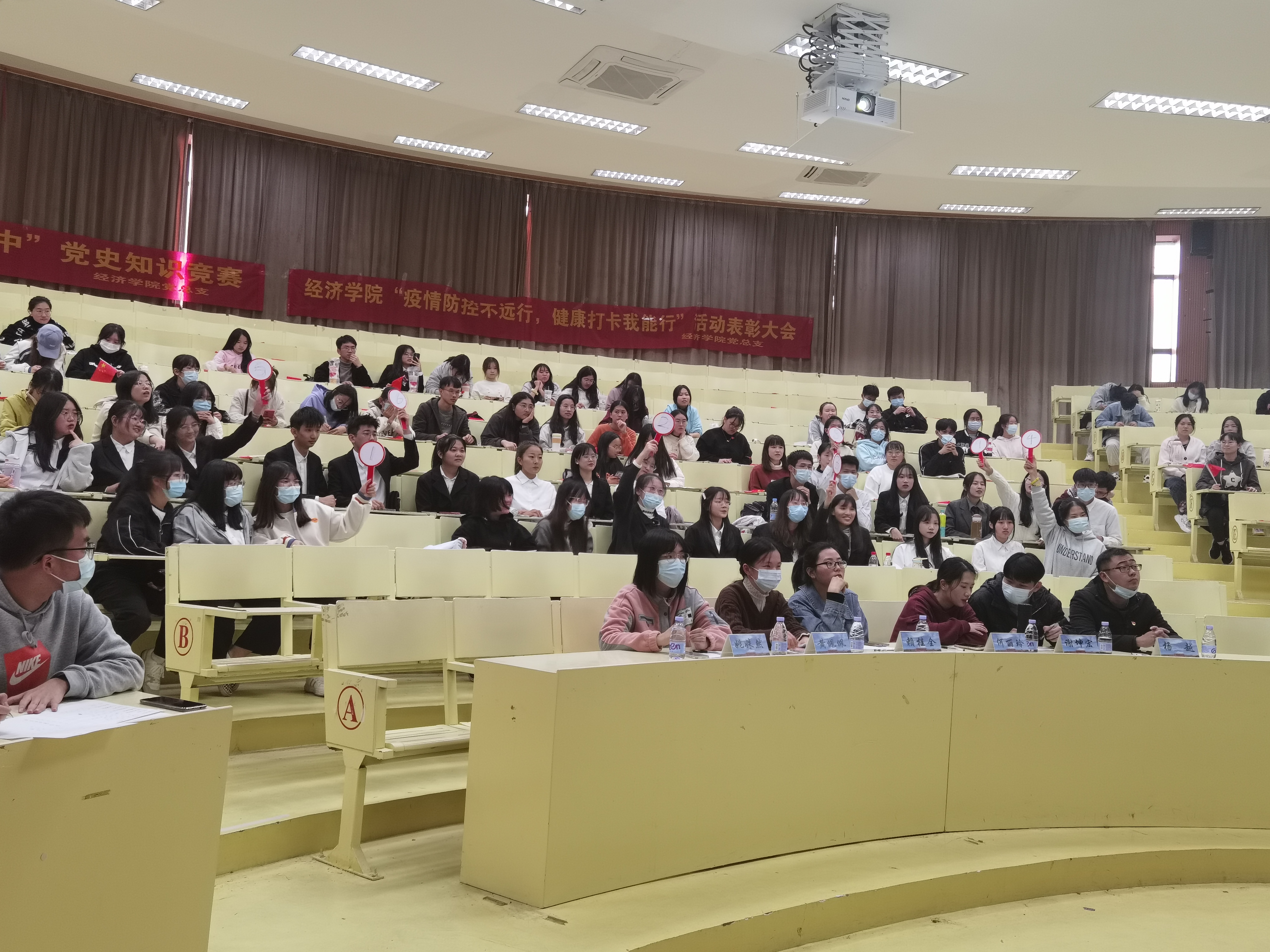 图1 现场抢答 本次党史知识竞赛采用线下抢答的方式进行,学院各班级和学生党支部高度重视。本次党史知识竞赛内容丰富,题目紧紧围绕党史、新中国史、改革开放史、社会主义发展史的内容展开,涉及知识面广、趣味性强。竞赛共有三种题型,包括必答题、抢答题、风险题。参加本次党史知识竞赛的有九支队伍,分别是金融系学生一支四支队伍,经济系学生一支两支队伍,经贸系学生一支三支队伍,每支队伍3人,一共27位比赛选手。比赛现场气氛紧张而热烈,选手们争先恐后、反应迅速、抢答积极,充分展示了学生扎实的党史知识理论基础。