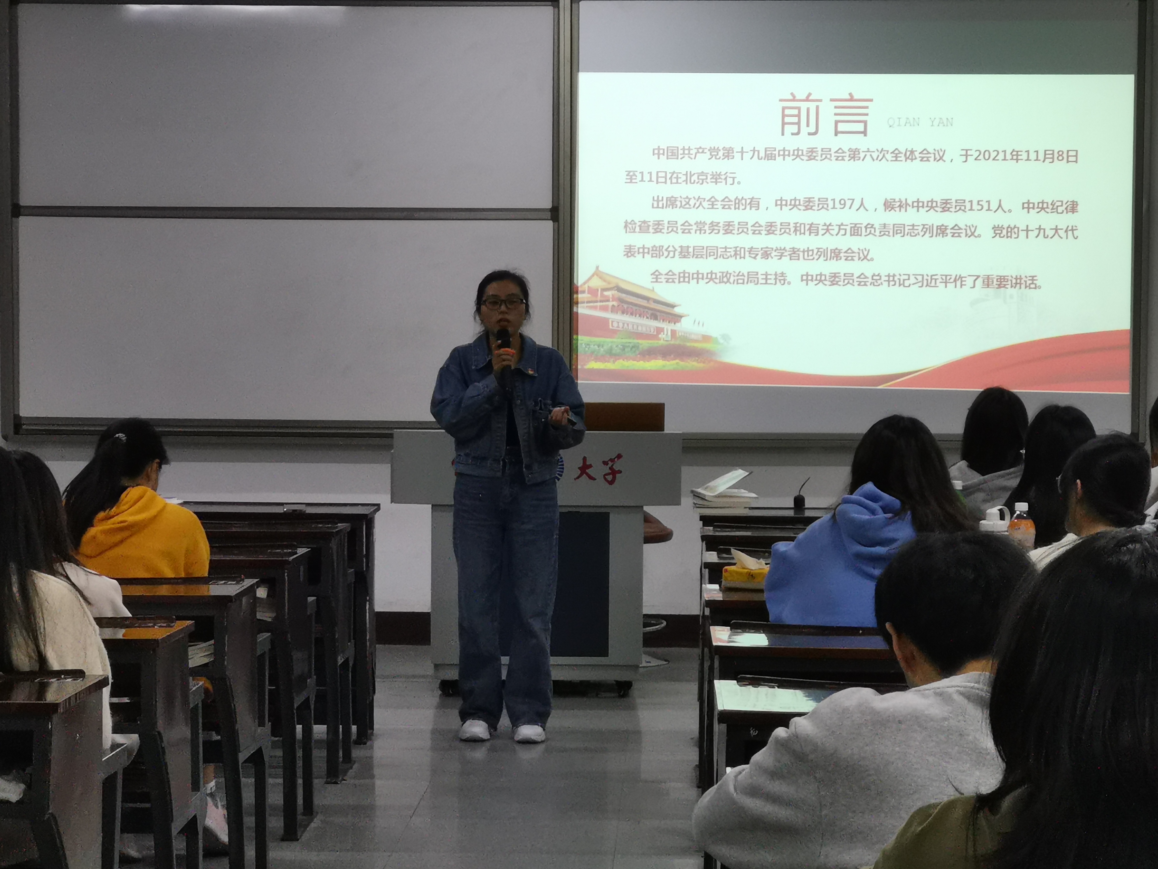 图1 支部书记赖桂全老师作学习会宣讲 会议中,书记赖桂全老师围绕“审议通过两个文件”、“总结重大成就和历史经验的三个需要”、“马克思主义的三次飞跃”、“百年历程创造的四个伟大成就”等九个重要方面,结合十九届六中全会的精神解读了中国共产党为什么能、中国在中国共产党的带领下为什么能够复兴、中国百年历程为什么能够取得如此多的伟大成就的原因。通过对十九大六中全会的深入学习,让我们知道了只有永远跟随中国共产党才能实现民族复兴、只有跟着中国共产党才能永保思想的先进性、让我们知道了学习党中央十九届六中全会精神的重要性。