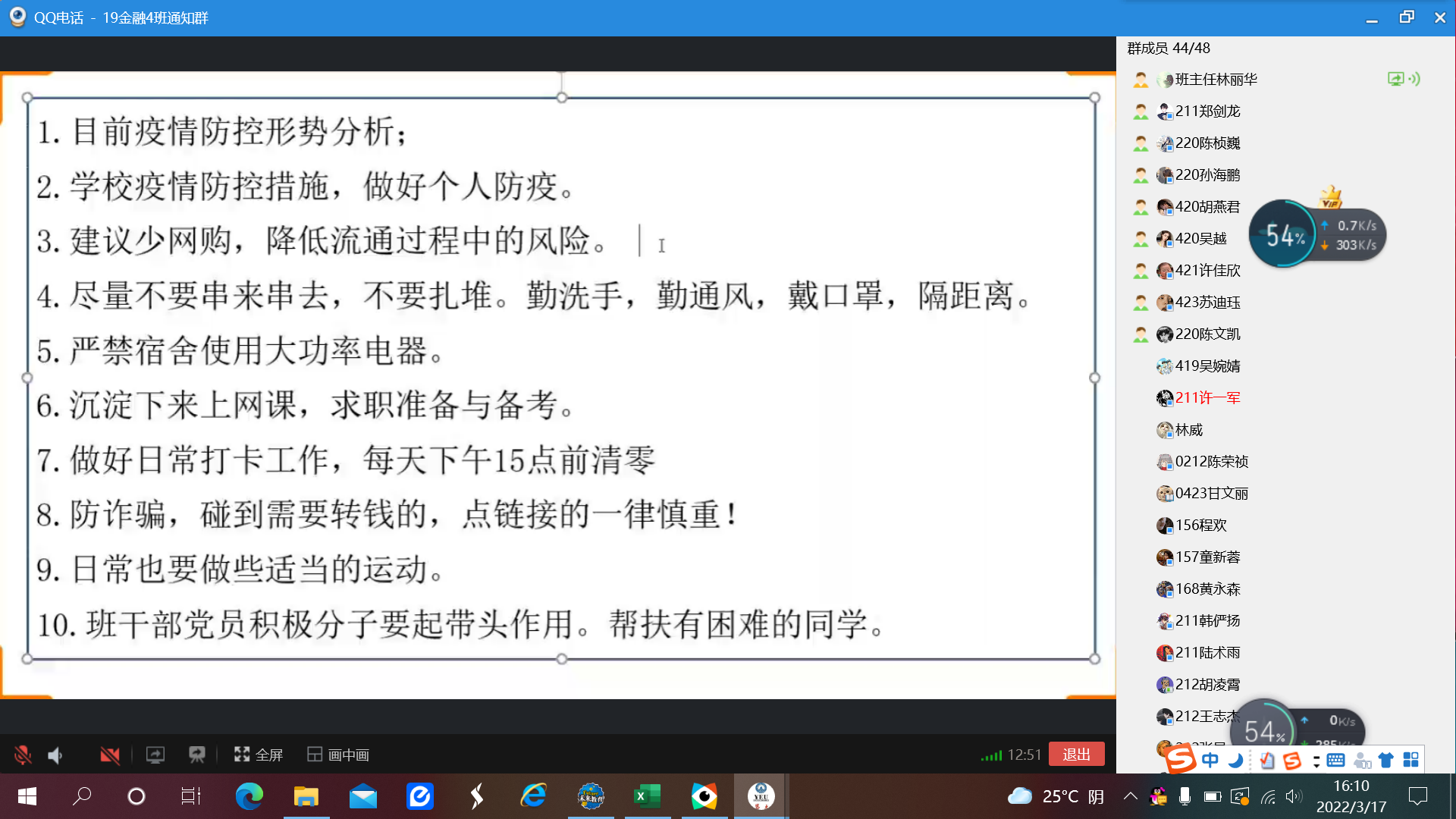为了加强疫情防控,打赢疫情战役,切实做好校园疫情安全预防工作,全面提高全体同学对新冠疫情安全防控意识。2022年3月17日,yl23411集团各班在线上召开了以“疫情防控”为主题的线上班会,yl23411集团各班全体学生参加了此次班会。