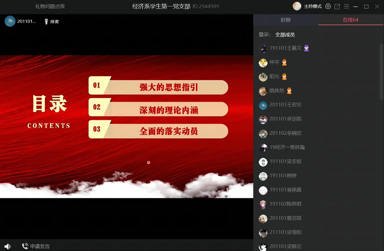 为进一步普及和全面落实“两会”精神,2022年3月24日晚上,yl23411集团经济系学生第一党支部开展“学习两会精神”线上学习交流会。本次主讲人为王宏志干事,参会人员为经济系学生第一党支部书记赖桂全老师、副书记姚姝然老师、组织委员仲平老师、宣传委员杨越老师以及支部全体成员。