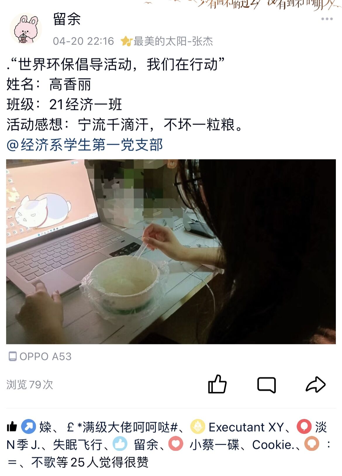 图1 支部成员参加光盘打卡活动 此次活动,党支部共组织开展四个系列活动。在活动期间,同学们通过线上拍照打卡的形式参与到本次活动中。其中,活动一以“资源回收”为载体,组织同学们收集生活中一些可利用的废物,充分发挥想象力和创造力,将废旧物品转化为有创意的小工艺品;活动二组织同学们制作以“保护环境,党员(积极分子)应该怎么做”为主题的画作、手抄报或海报;活动三提倡食物光盘行动,营造人人节约、事事节约的良好氛围,引导同学们树立节约环保、绿色低碳的生活理念;活动四以打扫身边卫生的形式,将环保意识真正落实进教室、进宿舍,让同学们懂得环保与自己息息相关,引导同学们身体力行,以主人公的责任感投入到环保活动中去。