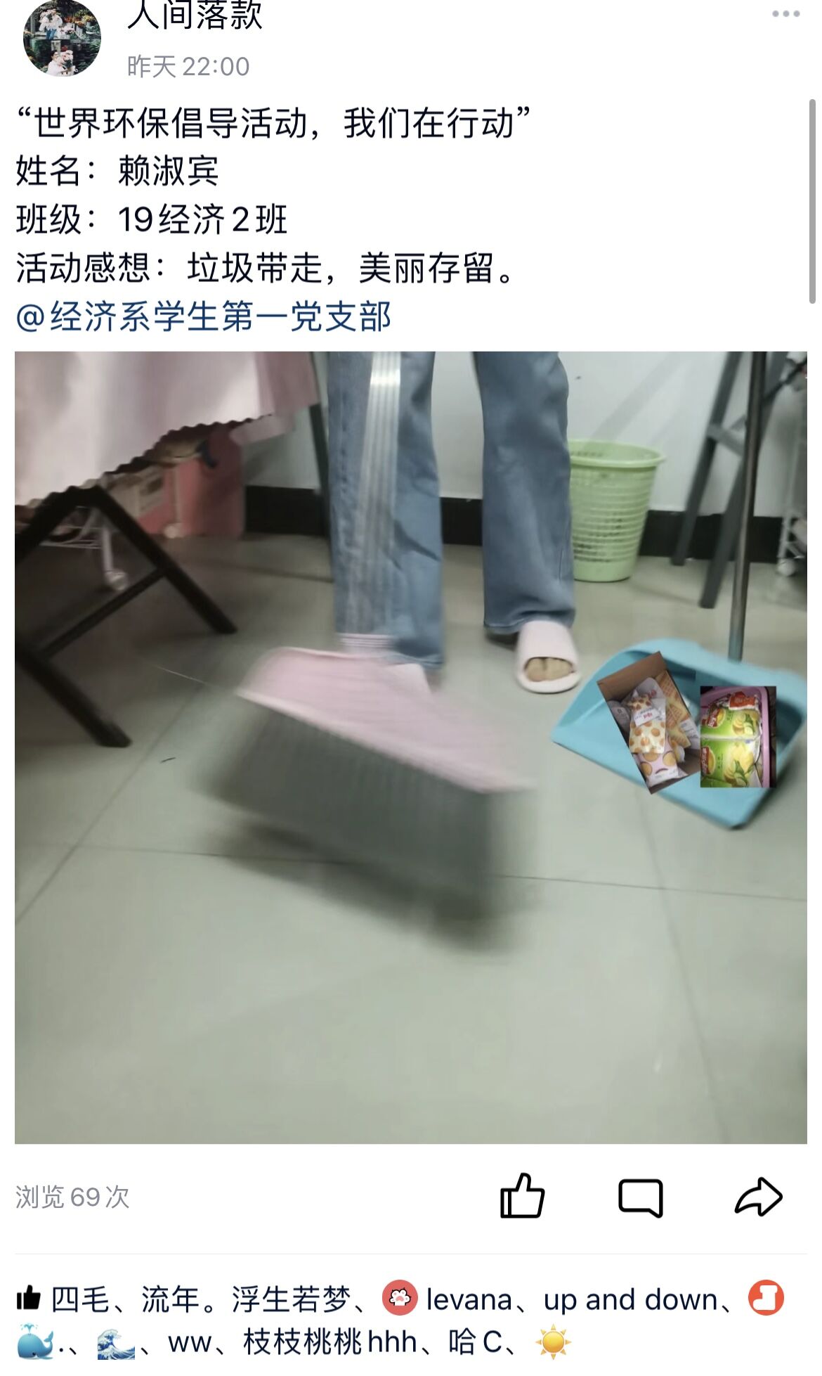 图2 支部成员参加环保卫生打卡活动 此次环保倡导活动得到了同学们的积极响应,培养了同学们勤劳、节俭的美德,实现了资源的回收再利用,增强了同学们的环保意识,有利于同学们用实际行动去响应环保理念、实现低碳生活,保护生态环境。(经济系学生第一党支部 刘欣粤/图文 审核:姚姝然、黄培真)