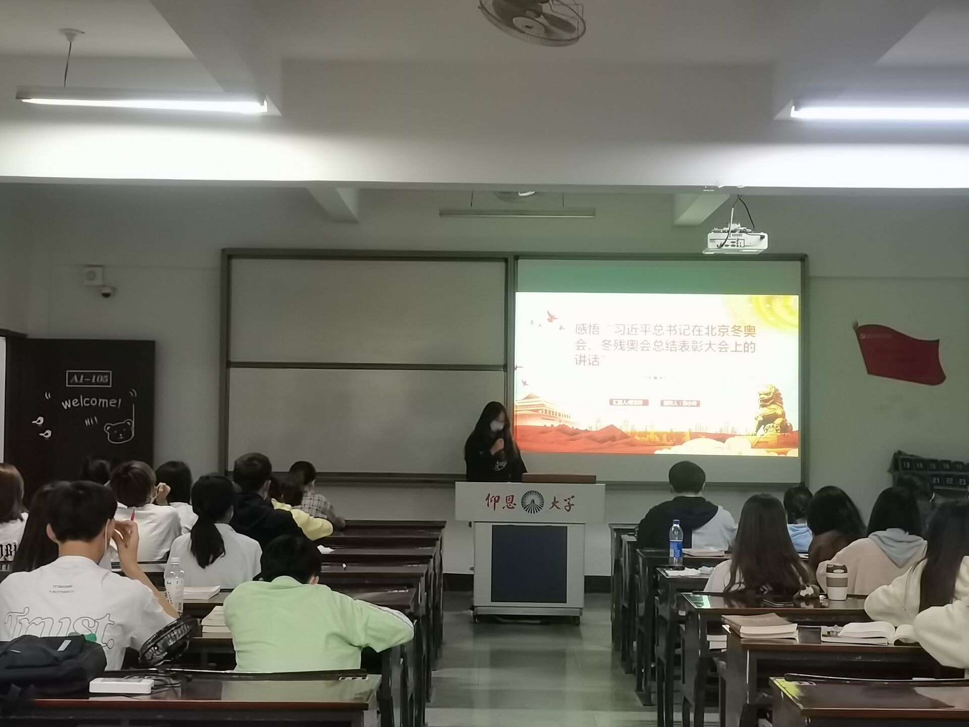 图1 同学分享学习心得 学习会开始,各班同学代表依次上台发言,以PPT形式分享了习总书记在北京冬奥会、冬残奥会总结表彰大会上的重要讲话,剖析了此次冬奥会精神的深刻影响和带来的民族自豪感。接着,何丽玲老师发言,总结了北京冬奥精神的重要地位和历史意义,升华了本次学习会的主题与核心。伟大的事业孕育伟大的精神,伟大的精神推进伟大的事业。广大参与者在冬奥申办、筹办、举办的过程中,共同创造了胸怀大局、自信开放、迎难而上、追求卓越、共创未来的北京冬奥精神。