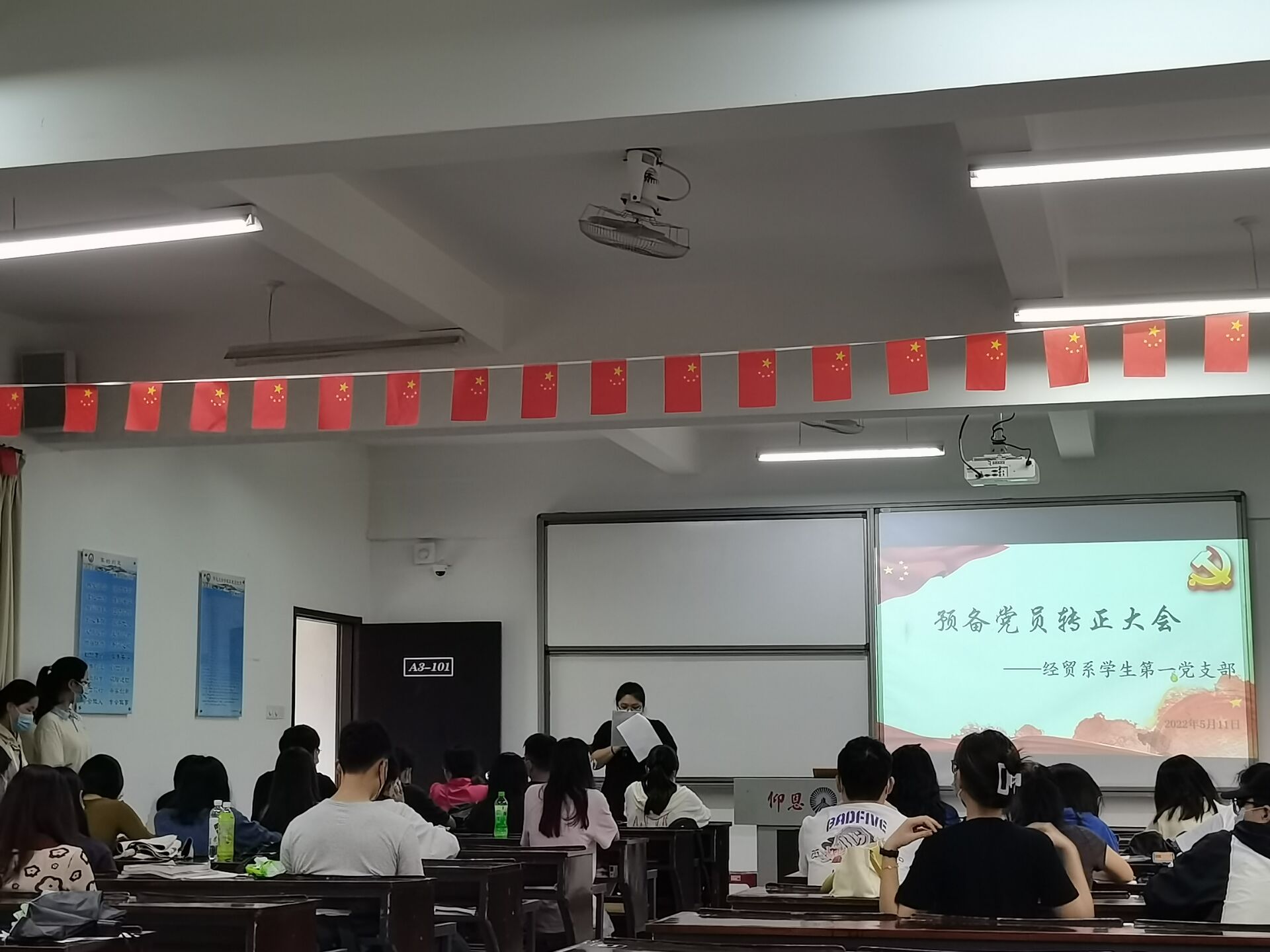 2022年05月11日,经贸系学生第一党支部于仰恩楼A3-101教室召开了预备党员转正大会。参加此次会议的有经贸系学生第一党支部全体党员。