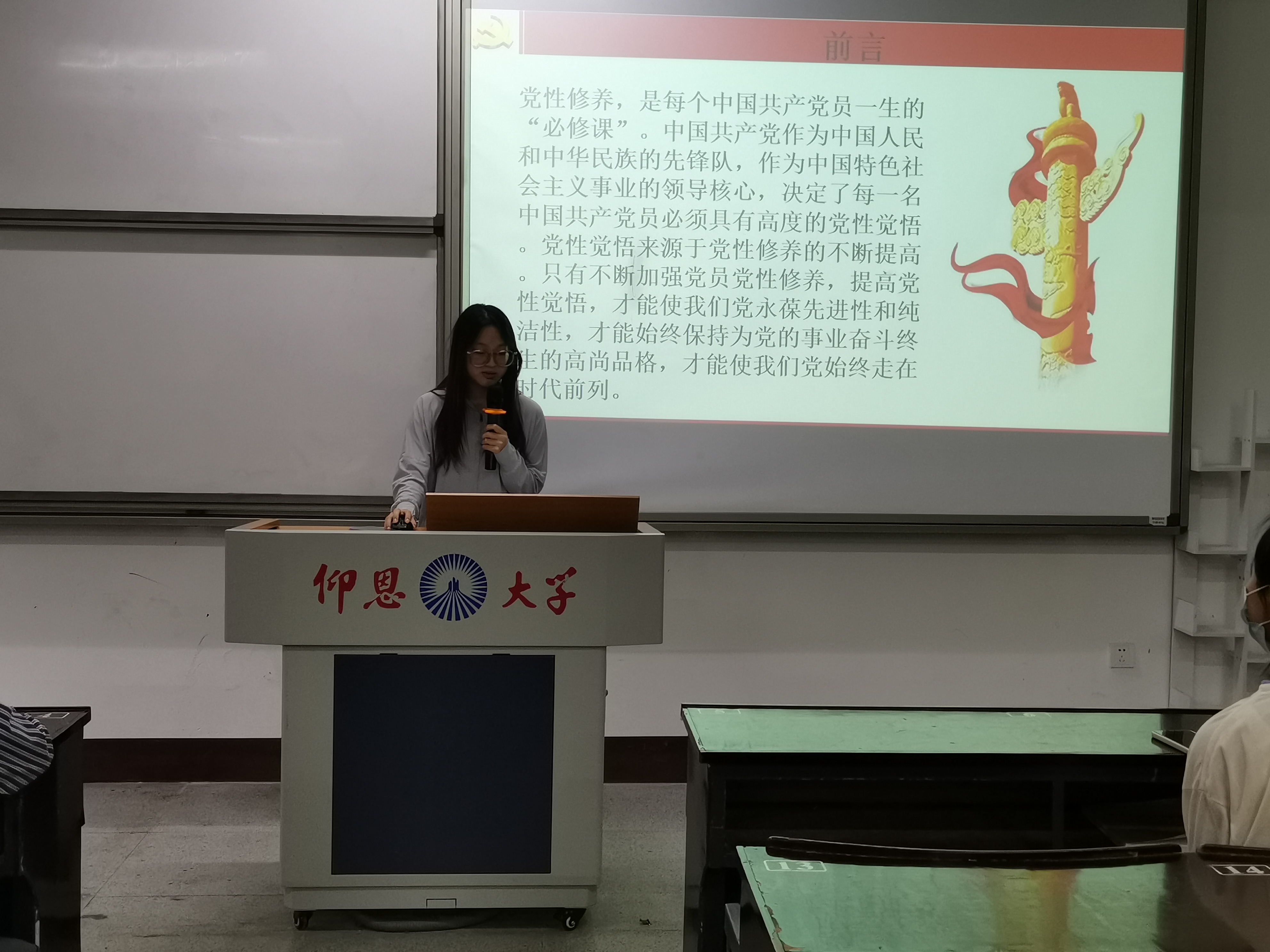 图1 詹羽琪干事在讲解PPT 会议上,王宏志干事从什么是党性修养、大学生党性修养的重要性、大学生加强党性锻炼和修养的内容、大学生如何夯实党性修养基础四个方面向大家讲解大学生党员党性修养的理论基础。学习大学生党员党性修养的理论基础,不仅有利于提高大学生党员的综合素质,还能够提高个人修养,在学习生活中更具有党员的先进性,从而树立正确的世界观、人生观是和价值观。共产党员的先进性不是天生具备的,而是通过不断地学习、实践、总结经验和提高自己的思想境界才形成的。