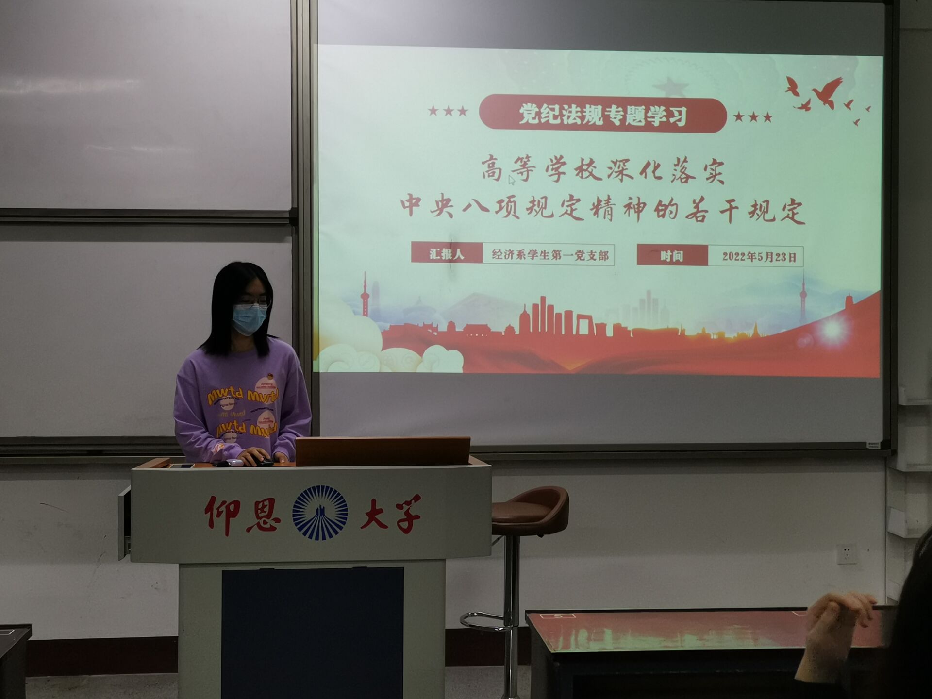 为进一步落实从严治党的要求,高质量推动学校党建工作的开展。5月23日晚,经济系学生第一党支部遵循支部全体成员共同学习与会后党员自主学习的原则开展了《高等学校深化落实中央八项规定精神的若干规定》党纪法规专题学习会,会议由经济系学生第一党支部副书记姚姝然老师主讲,支部全体党员参加会议。