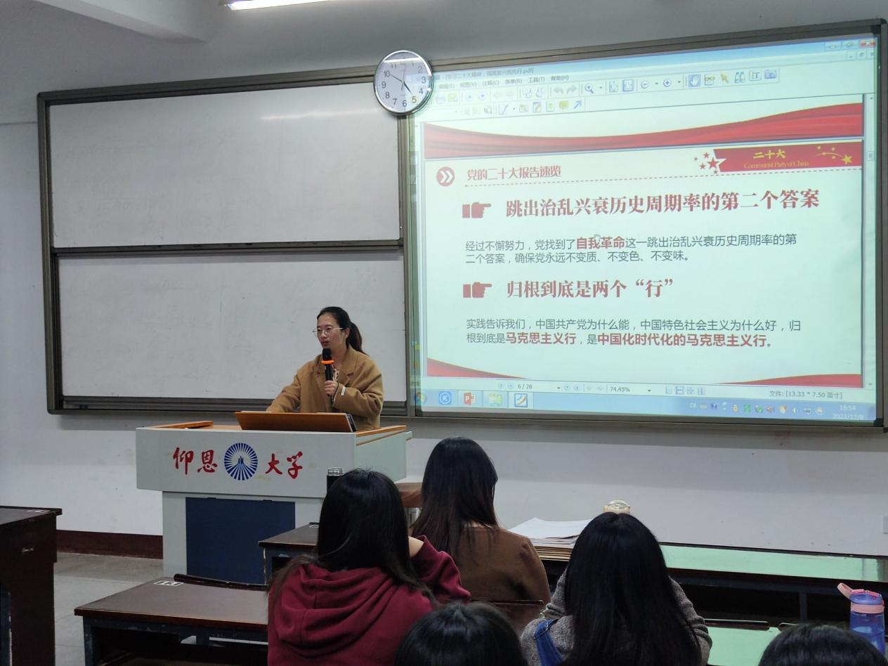 在课上,支部书记何丽玲老师主要围绕党的二十大报告和新党章展开,阐述党的二十大报告的重要部分和党章的新内容,勉励全体党员和积极分子要认真细致学习,力求全面准确领会党的二十大精神,深切领悟习近平新时代中国特色社会主义思想的精髓和理论力量。要从思想、行动上入党,认真学习贯彻落实二十大的精神,不忘初心,牢记使命,谦虚谨慎,艰苦奋斗,敢于斗争,善于斗争。