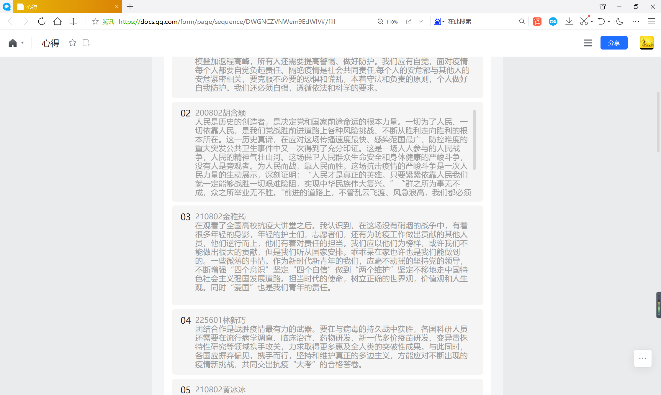 课后,我院教工支部各位同志也都纷纷发言讨论,都表明要以更严格的标准要求自己。做好科学防疫工作,不给党不给国家添麻烦。党员干部要做好疫情防控的宣传,让更多人对“打疫苗”有科学的认识,自觉打“第一针、第二针、第三针”,构筑起健康免疫系统。疫情防控,人人有责,精准高效做好疫情防控工作,离不开全体成员的共同参与,每个人都应当本着为社会、为自己、为家庭负责的态度,积极落实好各项防控措施,当好自身疫情防控“第一责任人”,通过每个人的努力,凝聚成群防群控的强大力量。(yl23411集团党总支 黄培真/图文)