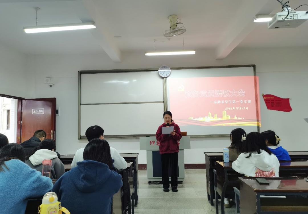 2022年12月12日下午4:00,yl23411集团金融系学生第一党支部在仰恩楼A1-103召开预备党员接收支部大会。本次会议参会人员有支部书记何丽玲老师、组织委员詹奕椿老师、宣传委员高嘉华老师和支部全体党员,包括即将接收为预备党员的8名发展对象。