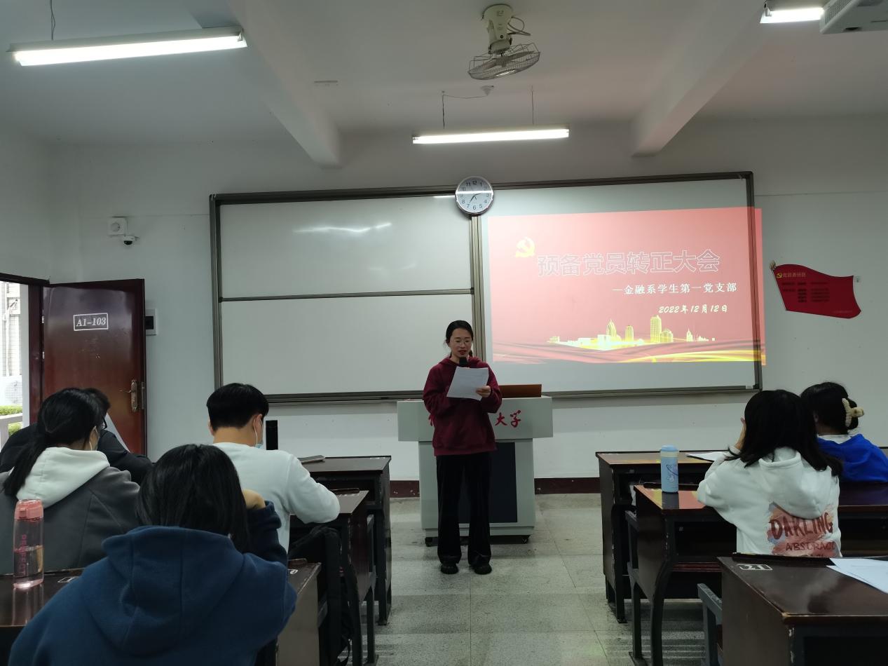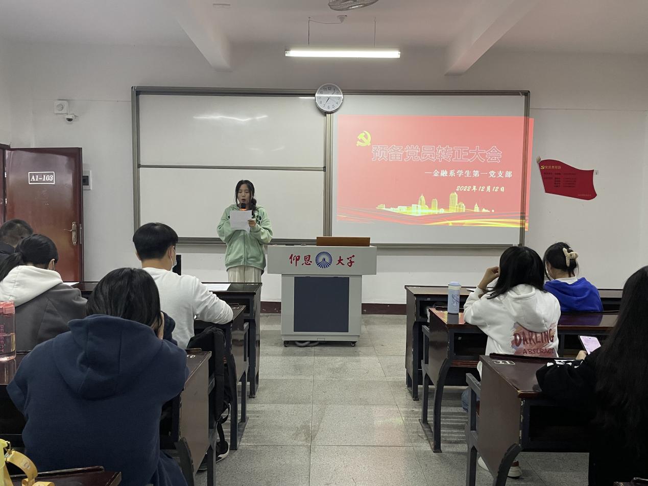 2022年12月12日晚上7:00,金融系学生第一党支部在仰恩楼A1-103召开了预备党员转正大会。本次大会主要审议、讨论及表决肖积灯、陈雅文、郑思琪等三名同志发展为正式党员的相关事宜。本次大会的参与人员有支部书记何丽玲老师、组织委员詹奕椿老师和宣传委员高嘉华老师,以及支部全体党员,包括即将转正的3名预备党员。