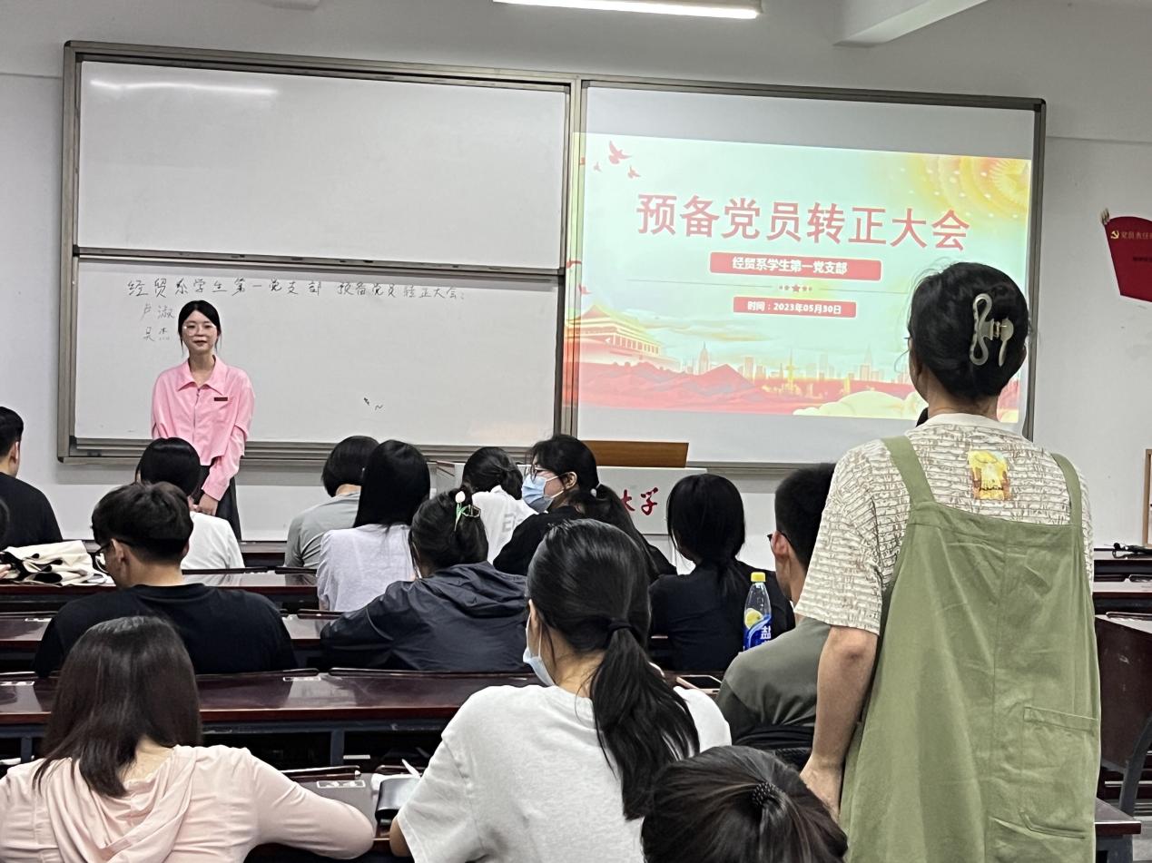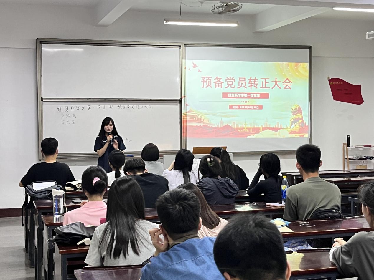 为深入学习贯彻习近平新时代中国特色社会主义思想主题教育,全面贯彻落实党的二十大精神,加强党员队伍建设,5月30日晚,经贸系学生第一党支部于仰恩楼A1-105召开预备党员转正大会。本次会议由支部书记黄培真主持,支部全体党员参会。