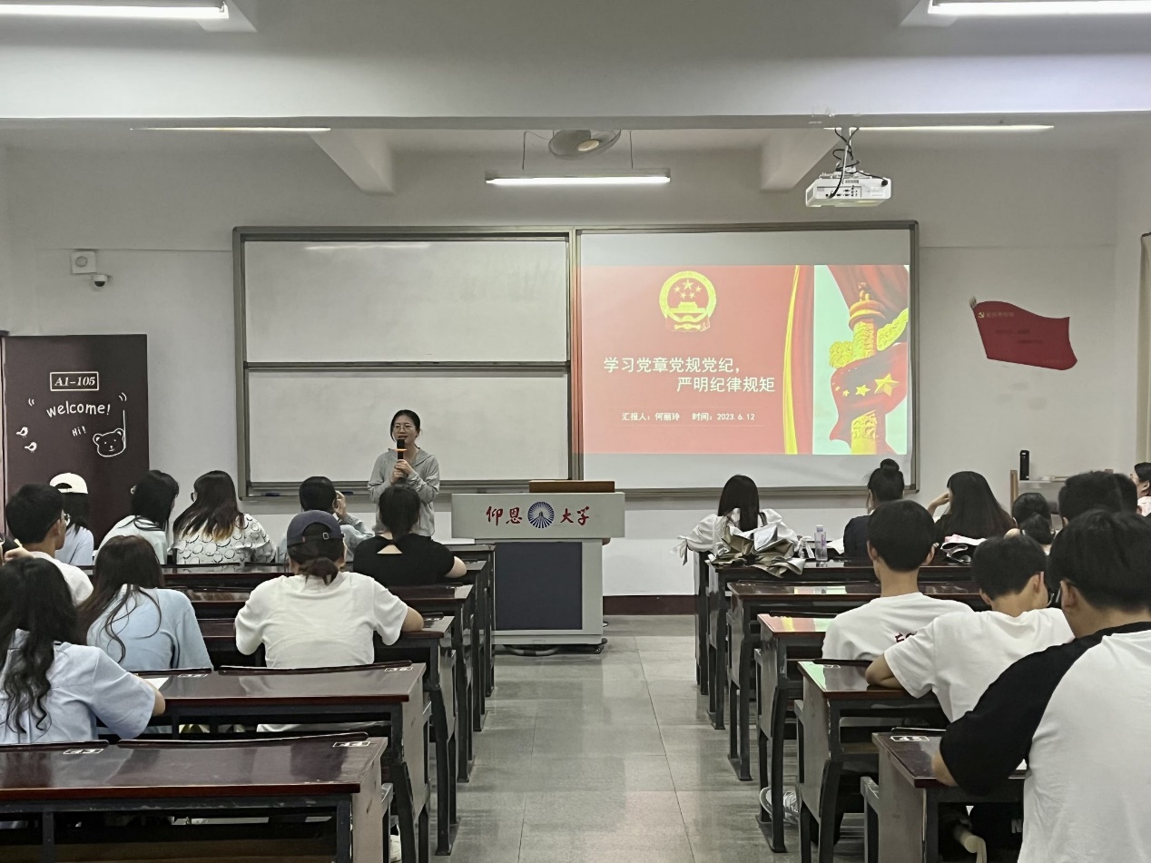 为学习领会党的二十大关于全面从严治党重大决策部署,深入落实习近平总书记关于严守党章党规党纪的重要论述和重要指示精神,2023年06月12日下午5:20,金融系学生第一党支部在仰恩楼A1-105组织开展党章党规党纪专题党课。此次党课围绕“学习党章党规党纪,严明纪律规矩”主题展开,由支部书记何丽玲老师主讲,支部全体党员及各班积极分子代表参加了此次党课学习。
