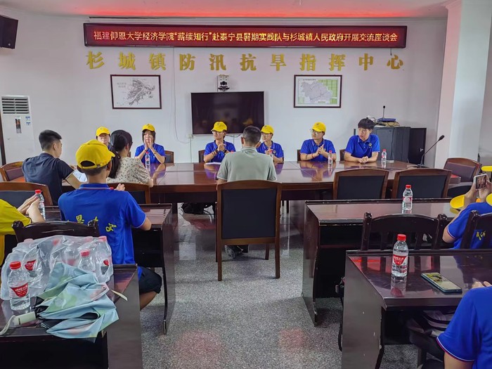7月3日,团队全体成员顺利抵达福建省三明市泰宁县,到达了这座省级历史文化名城。安顿休整后,实践队全体成员到达泰宁县杉城镇人民政府,与泰宁团委副书记李俊杰、旅游办负责人邓玲莹、杉城镇组织委员许家晓开展交流座谈会。