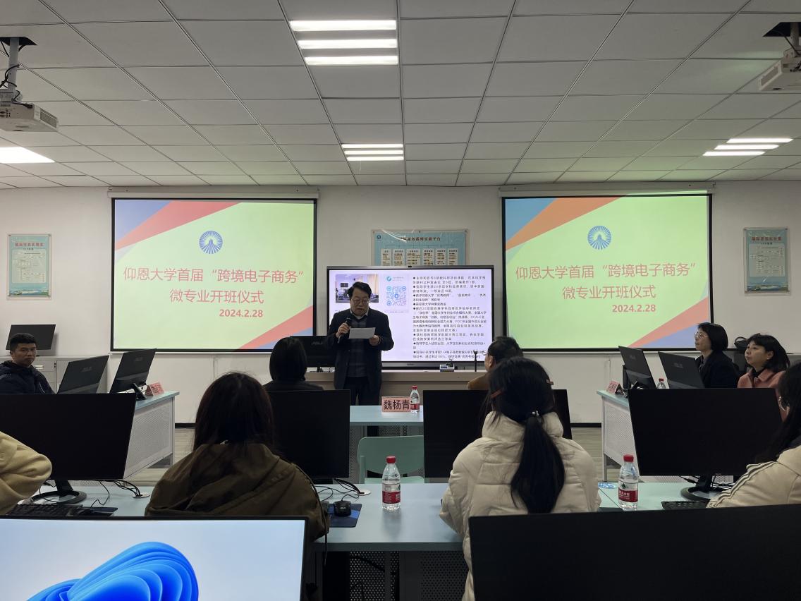 魏杨青在致辞中对首批入选学生表示热烈祝贺,他指出,高等学校的根本任务是培养人才,是培育新质生产力。新一轮本科教育教学审核评估对个性化人才培养模式的建设尤为关注,微专业是学校在“四新”建设背景下,主动适应新技术、新产业、新业态、新模式发展需求,促进学科专业间交叉融合以及推动人才培养改革创新的新探索、新举措。学校非常重视微专业的建设与管理,制定了《yl23411永利集团微专业建设管理办法(试行)》(仰大教〔2023〕24号),并依托开课单位yl23411集团的省级一流专业、一流课程和省级虚拟教研室,不断加强微专业建设中实验实训平台搭建、优质课程开发和教研活动创新。希望同学们珍惜学习机会,潜心实践,圆满完成学习课程,成为新一代复合型跨境电商高级人才。