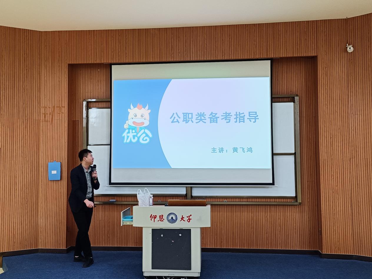 首先他给同学观看预计未来几年的毕业生数据,意味着考公人数的激增以及难度系数的增加,分析了考公热门的主要原因。又给大家介绍了公考的基础要点,如公考包括公务员、事业单位、报考的条件、考公务员的意义、考试时间及流程等。其次,细致地讲解了考试流程以及近年来考公例子,并教给同学们一些实用的方法和技巧。最后,他用通俗易懂的语言充分回答了同学们关于公考的种种疑惑和问题,给处于未来择业迷茫期的同学们很好的启发,使经院学子对考公有了进一步的了解。