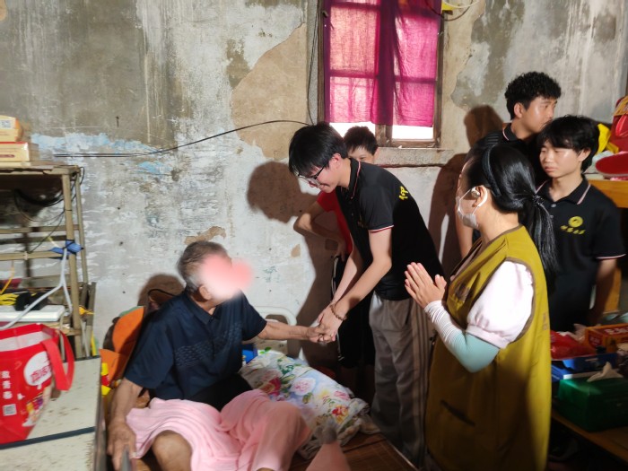 在慈济大爱美好生活馆师姐的带领下,队员们认真了解这些贫困家庭的情况,接着驱车前往灵秀镇看望那些疾病缠身的老年人,大多数都是贫困家庭,实践队员们有序走进他们的屋内,亲切问候病人,理解他们的难处,并且在倾听完病人自述其经历之后都一个接一个上前和他们握手,表示慰问和鼓励,他们也同样祝福实践队员们学业更上一层楼。慈济大爱美好生活馆的师姐们也给予他们物质上的帮助,并且这种资助是长期给予的,实践队员们在最后祝他们能够早日康复。