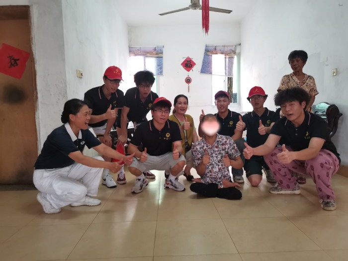 当实践队员们得知病人因手脚不便,无法自己收拾屋子之后又看到杂乱不堪的房间,便起身开始动手整理,套被单、叠衣服、扫地、拖地,大概过了40分钟,原本凌乱的屋子被实践队员们收拾得干净整洁,对此病人连连道谢,为他们竖起大拇指。实践队员们用实际行动帮助有困难的人,给他们带去生活上的便利和心灵上的鼓励和安慰。