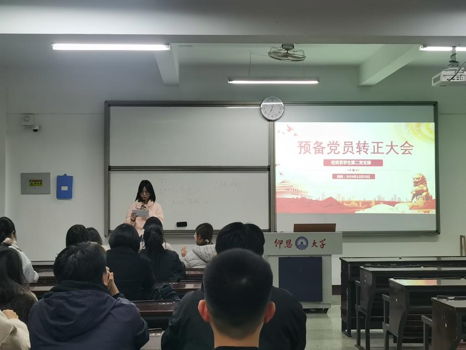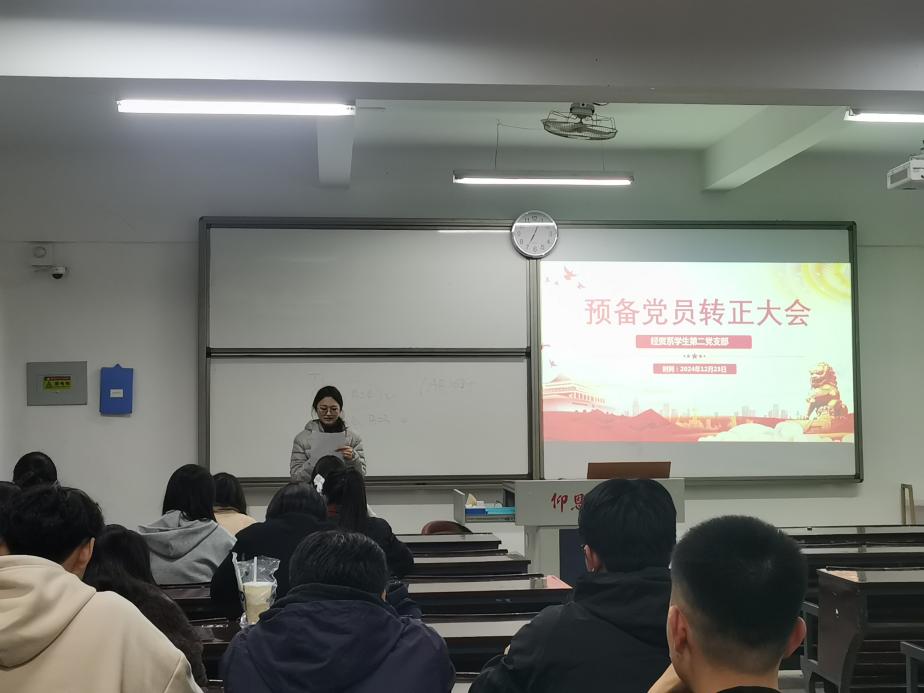 为严格落实发展党员要求,加强基层党组织建设,12月23日晚,经贸系学生第二党支部召开党员大会,讨论表决吴婧绫等三名预备党员的转正事宜。本次党员大会由支部书记李荣美主持,经贸系学生第二党支部全体党员出席会议。