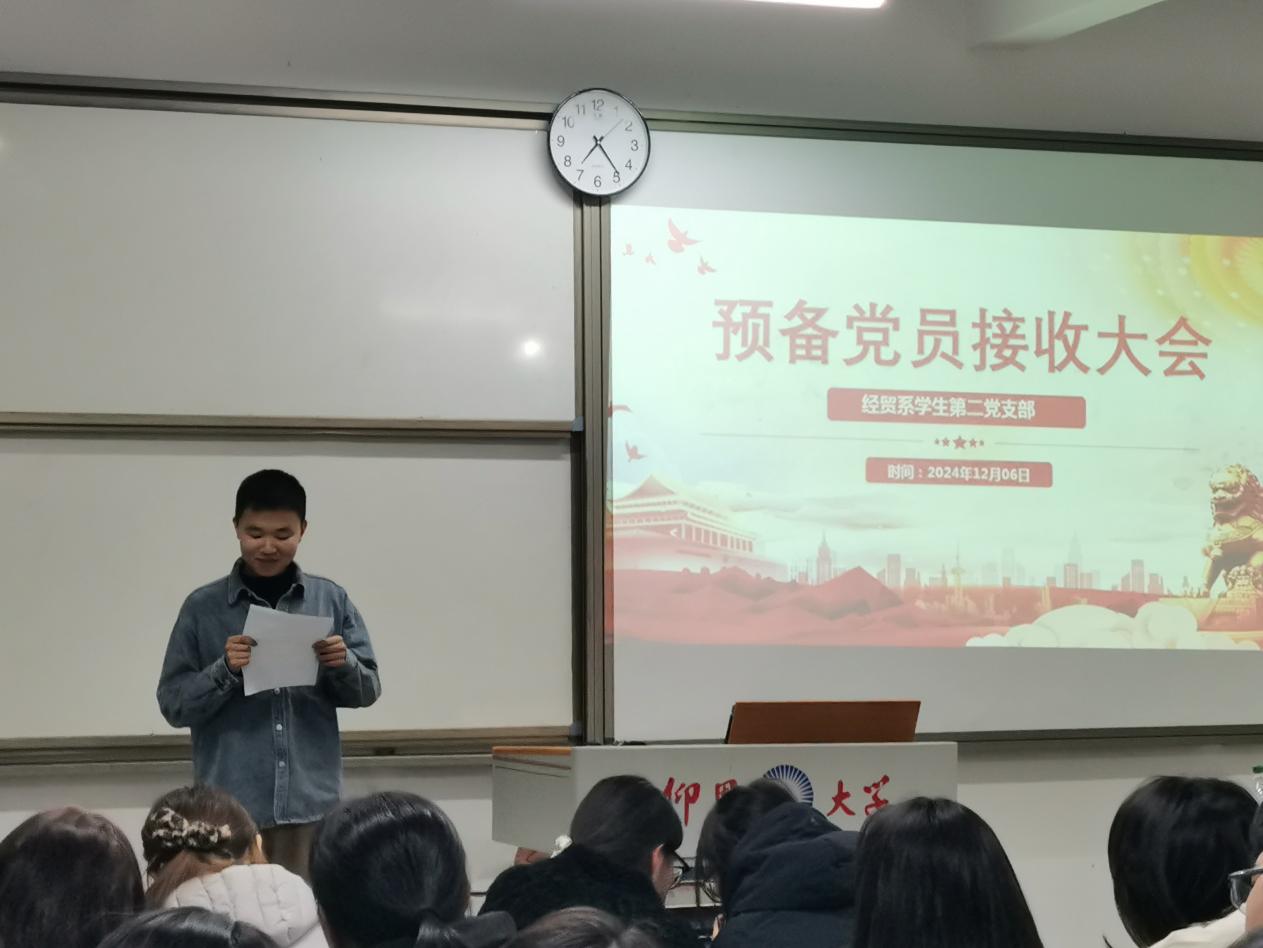 2024年12月06日晚19:00在仰恩楼A1-109,yl23411集团经贸系学生第二党支部召开预备党员接收大会,主要讨论吸收新党员。支部书记李荣美等支部全体15名党员参加了此次接收大会。
