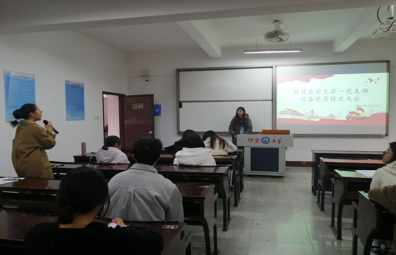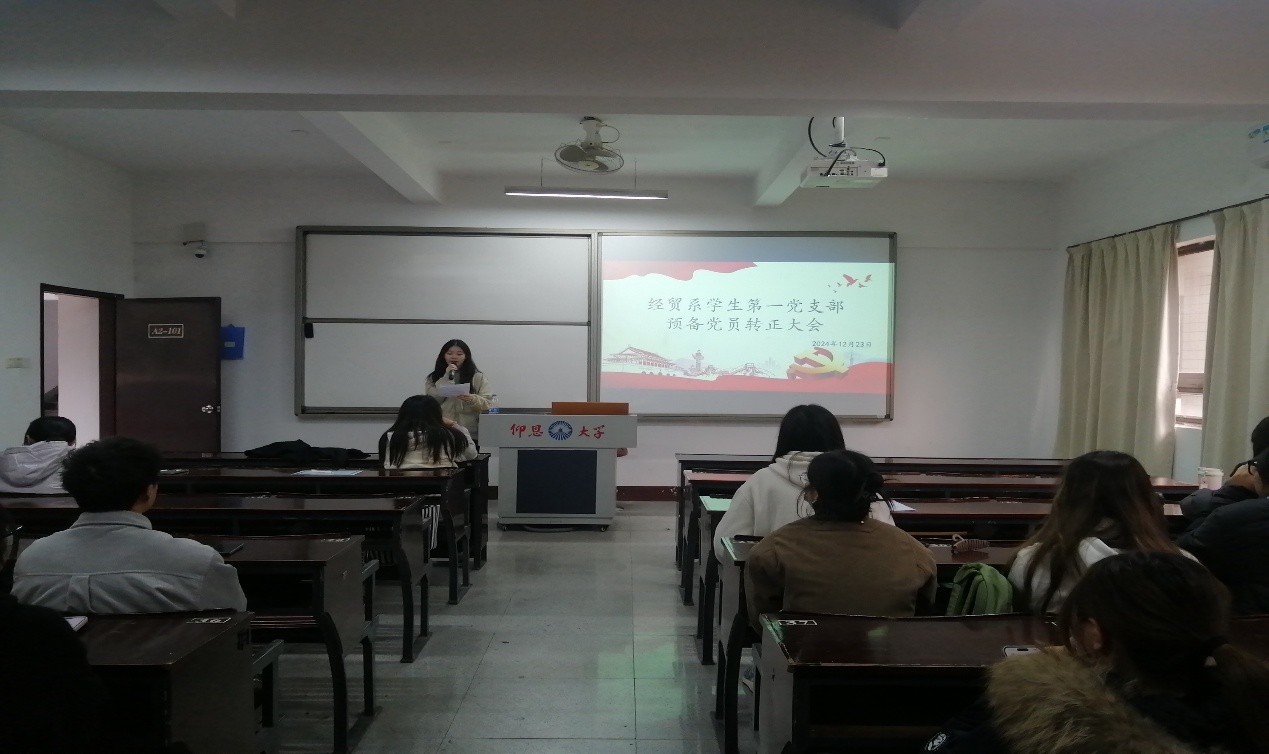 12月23日下午,经贸系学生第一党支部于仰恩楼A2-101召开预备党员转正大会。