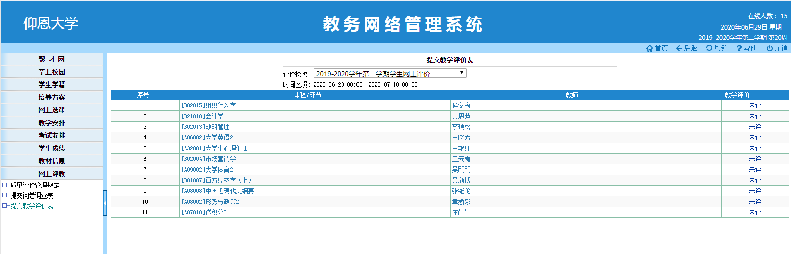 评教为匿名评价,教师仅能查到各任课教师总体评价结果。学生不用担心对任课教师的评价会给自身带来负面影响,应结合教师教学过程和自我学习收获,在规定时间内、客观公正地进行评价。