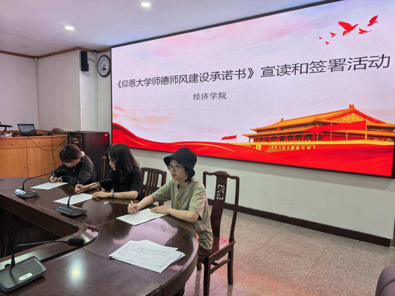 吴晓伟书记代表宣读《yl23411永利集团师德师风建设承诺书》,由财政学与金融学系、经济与贸易系、经济学系三位新入职教师作为代表上台签署承诺书,全体教职工签署承诺书。